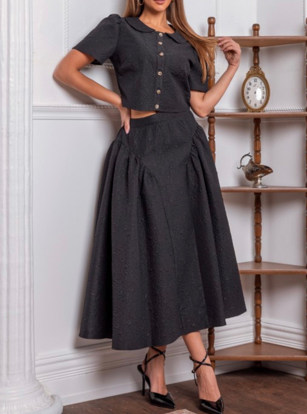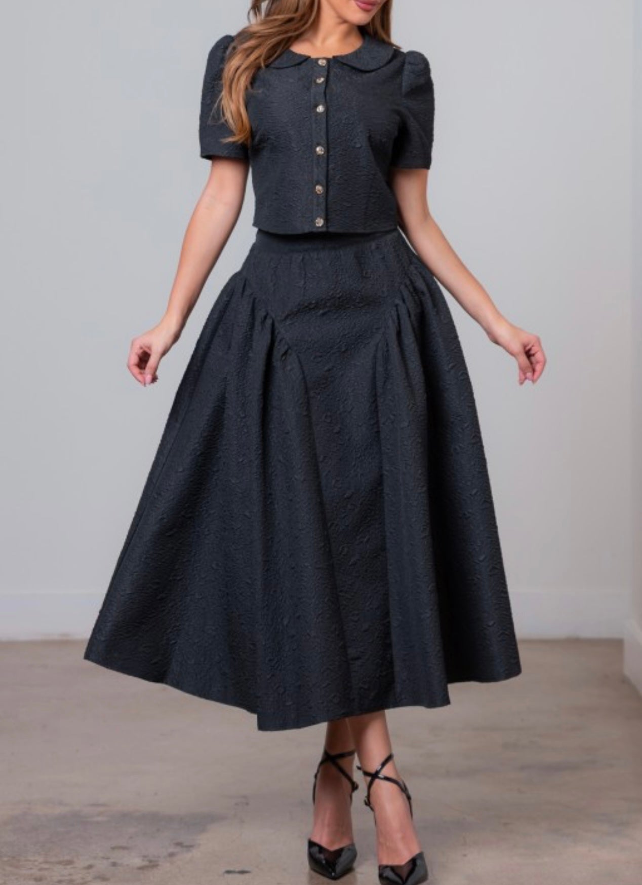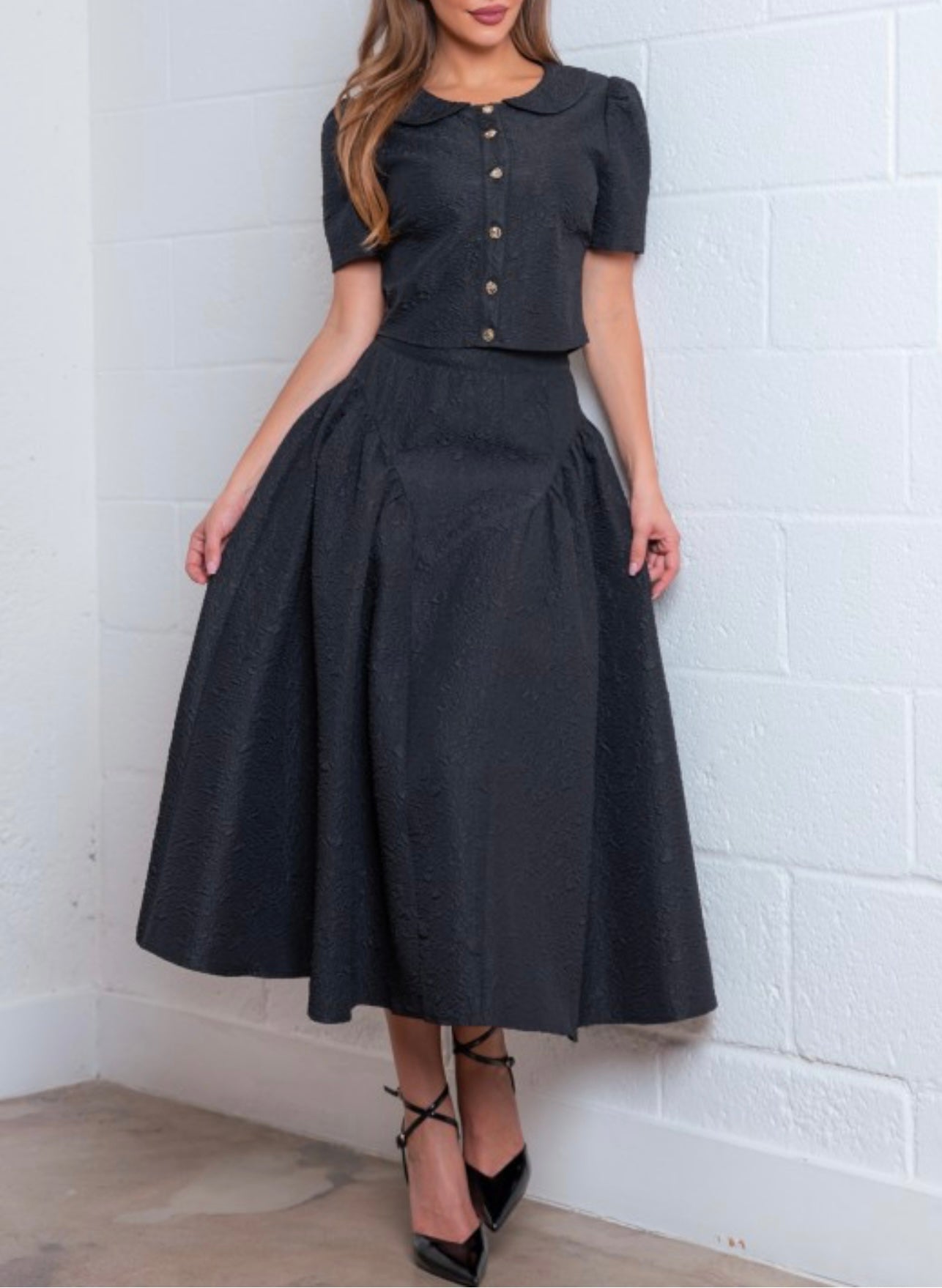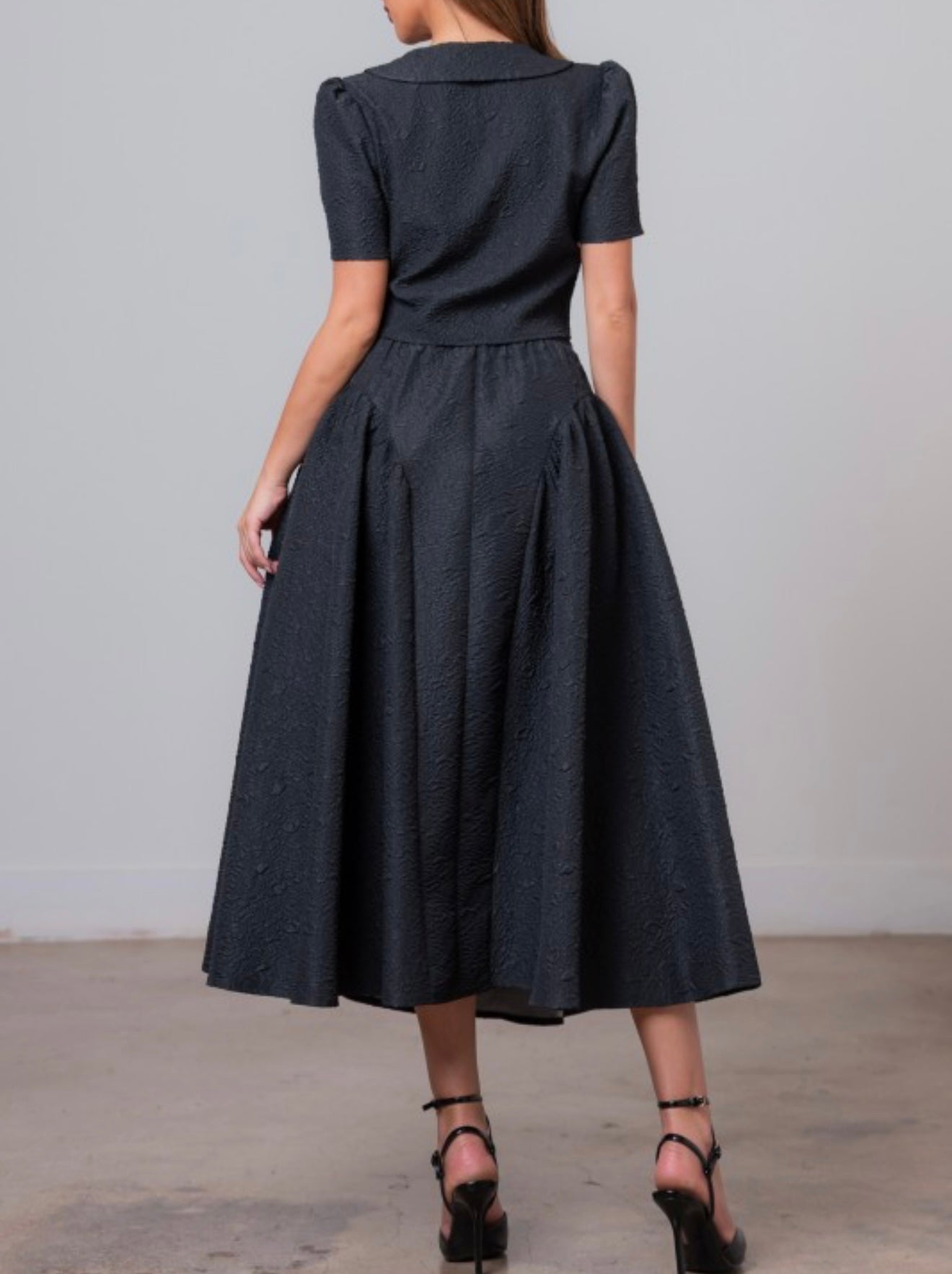 - Details: Button Down, Collar, Puff Sleeve, Texture, Cinched Waist, Maxi, Back Concealed Zipper, Set.