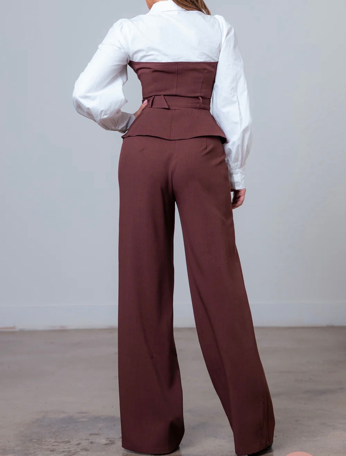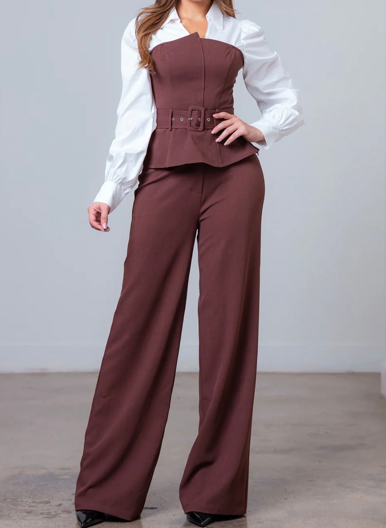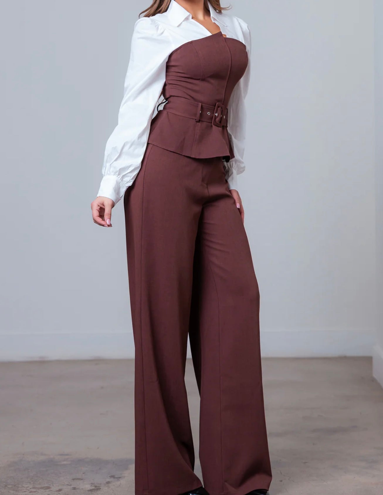 - Details: Cinched Waist, Adjustable Belt, Side Zipper Shirt, Front Zipper Pants, Collar, V-neck, Long Sleeve.