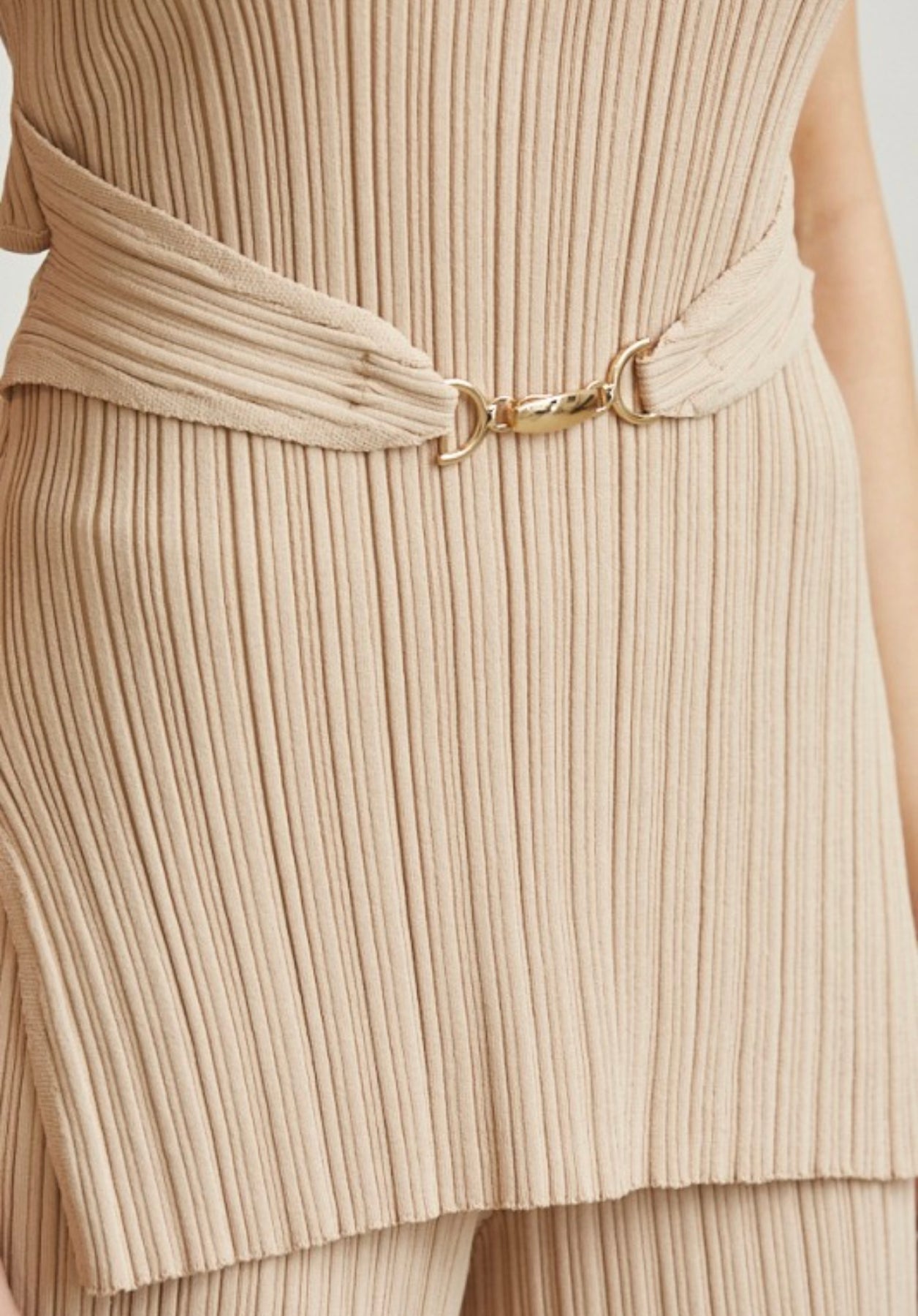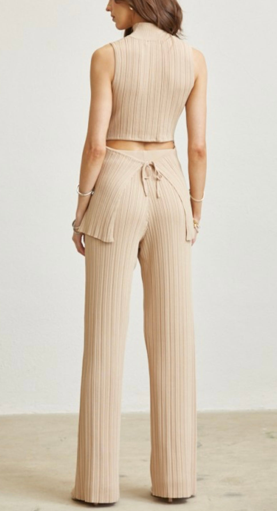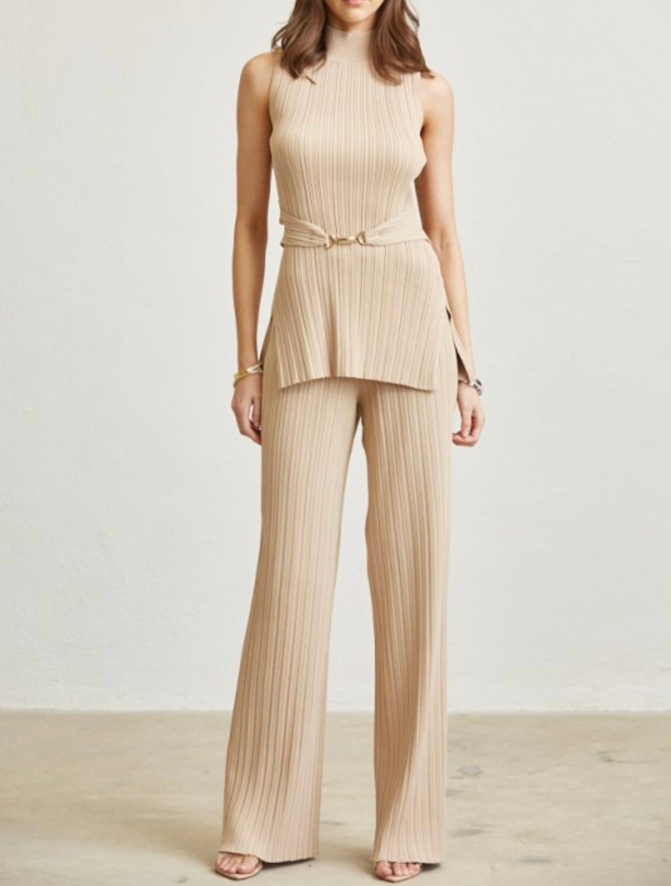 Chic and effortless, this top and pant set is crafted from a stretchy ribbed knit fabric that moves with you. The high-neck top features a slit-back design with a self-tie detail for a touch of sophistication, while tiny side slits add subtle allure. Finished with gold-tone hardware trim for a polished accent. The high-waist, wide-leg pants offer a flattering fit with an elasticized waistband for all-day comfort and style.