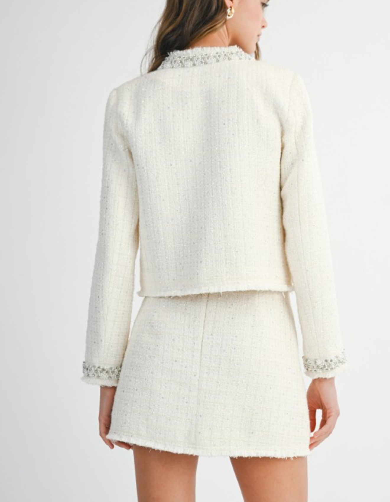 Sequin tweed long sleeve with jewel trim detail front hook and eye closure jacket and matching mini skirt set. Top has front pocket detail. Skirt has back invisible zipper. Lining.