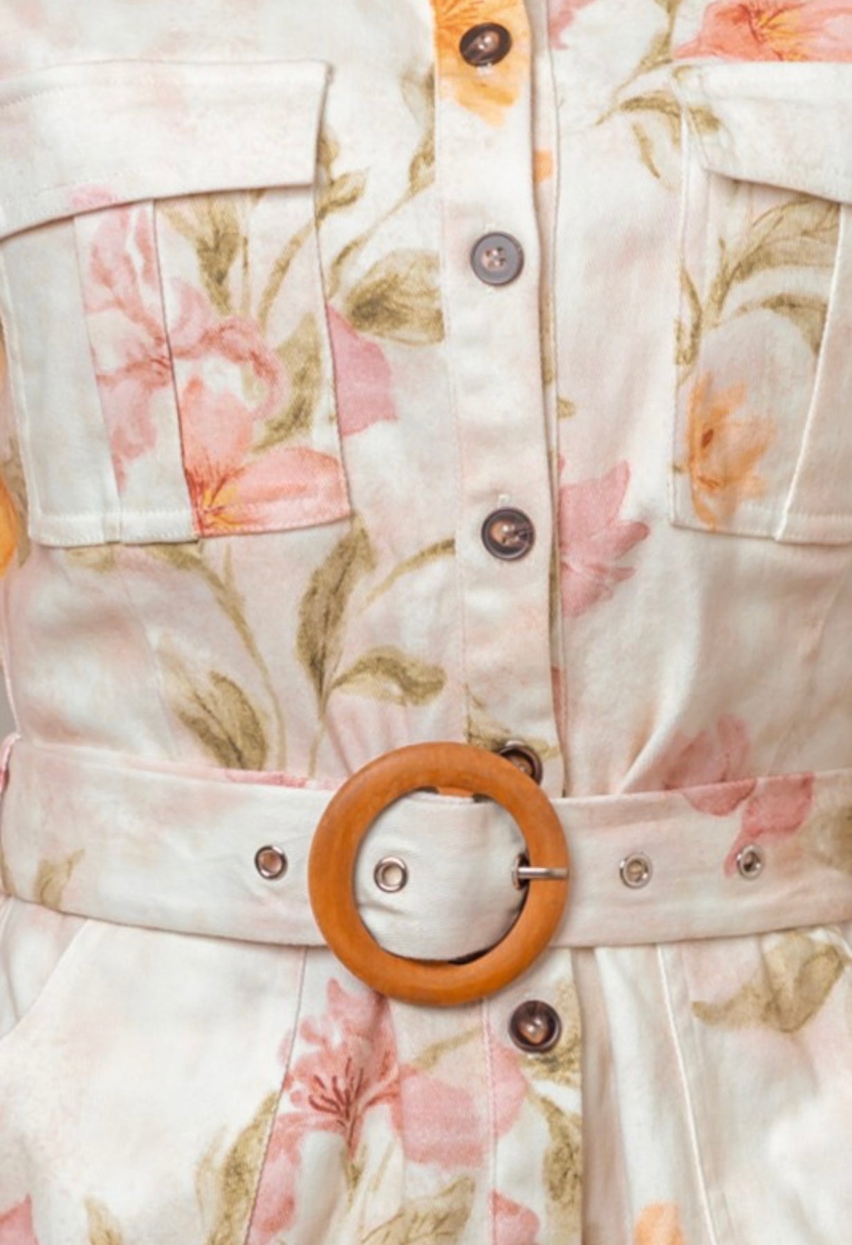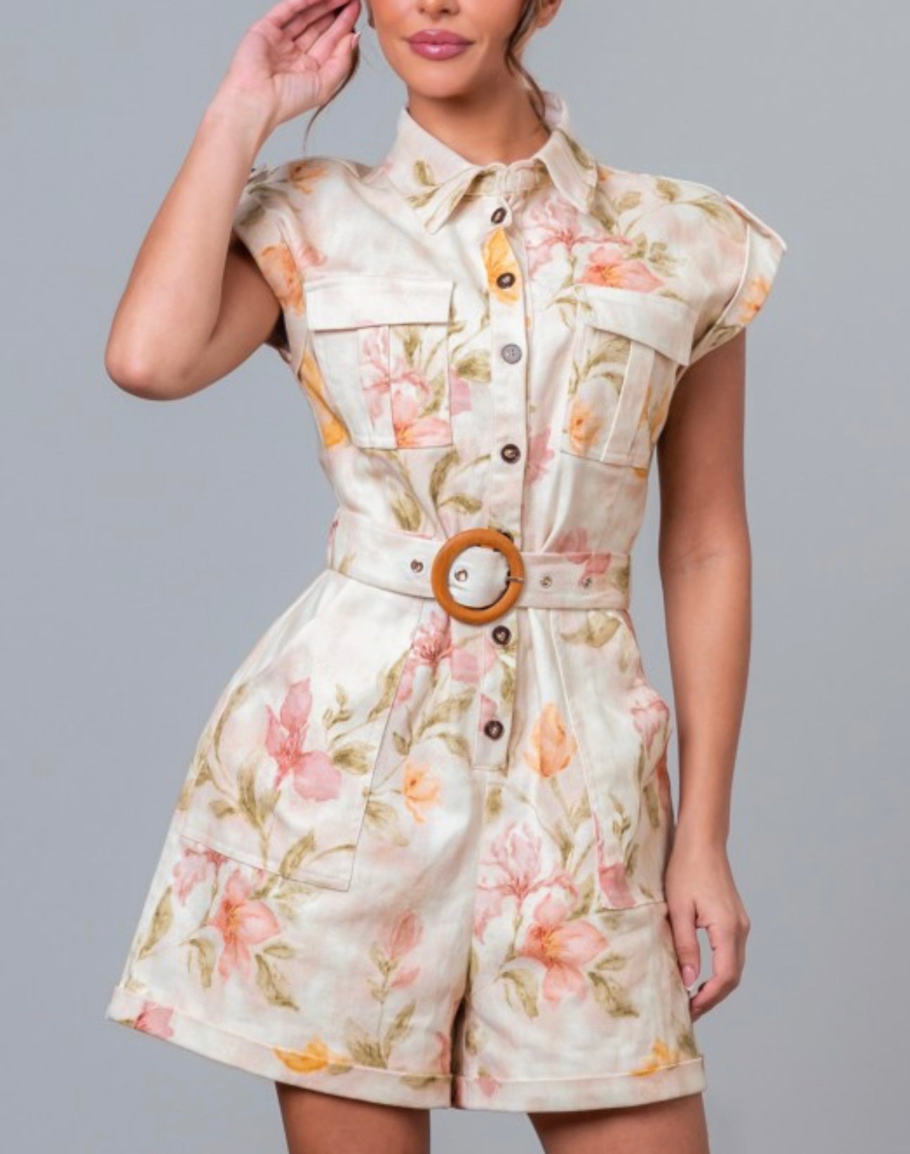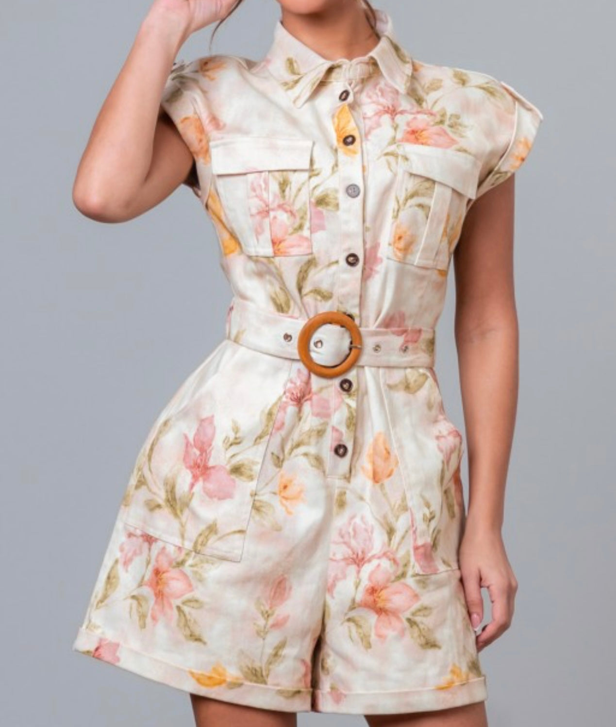 Floral Print Collar Romper featuring a cream multi floral pattern on a structured, non-stretch fabric. Designed with a classic collared neckline and short roll-up sleeves, this romper blends effortless style with everyday function. It includes breast pockets, side pockets, and an adjustable belt that cinches the waist for a flattering fit. Perfect for a polished yet relaxed look.