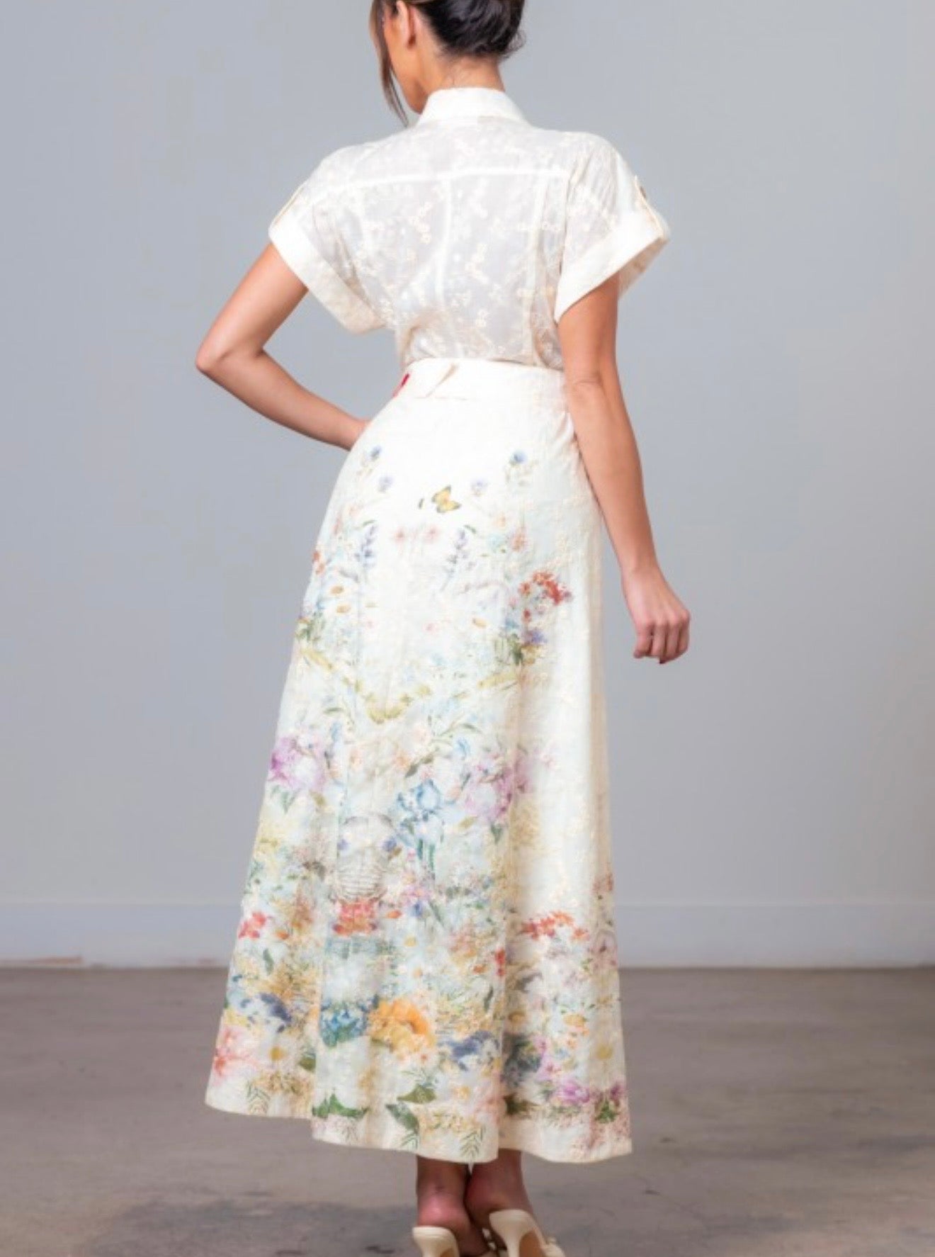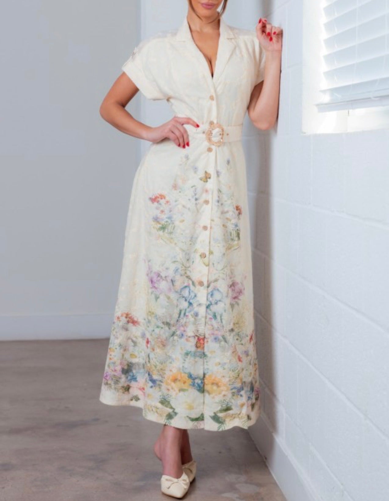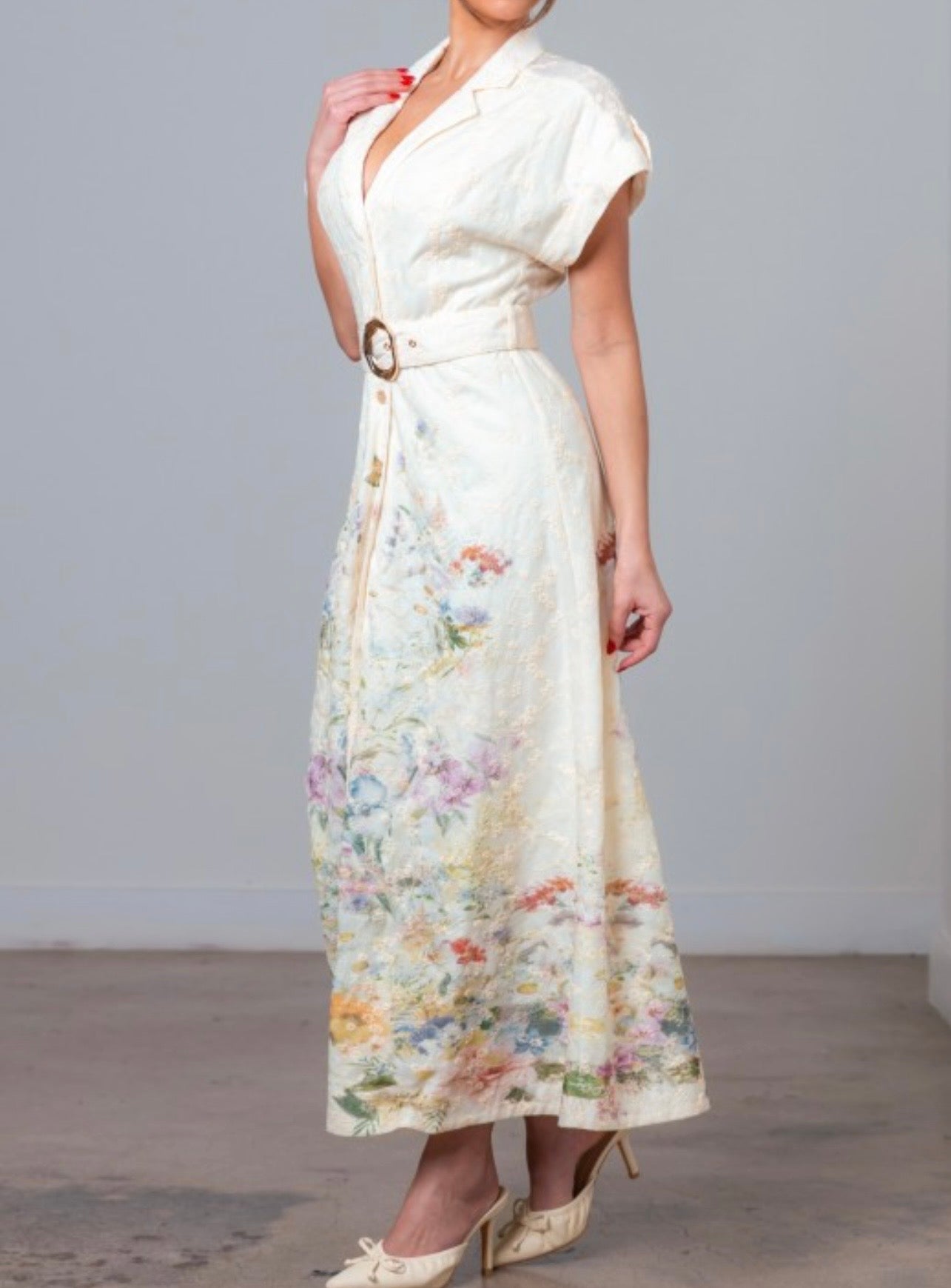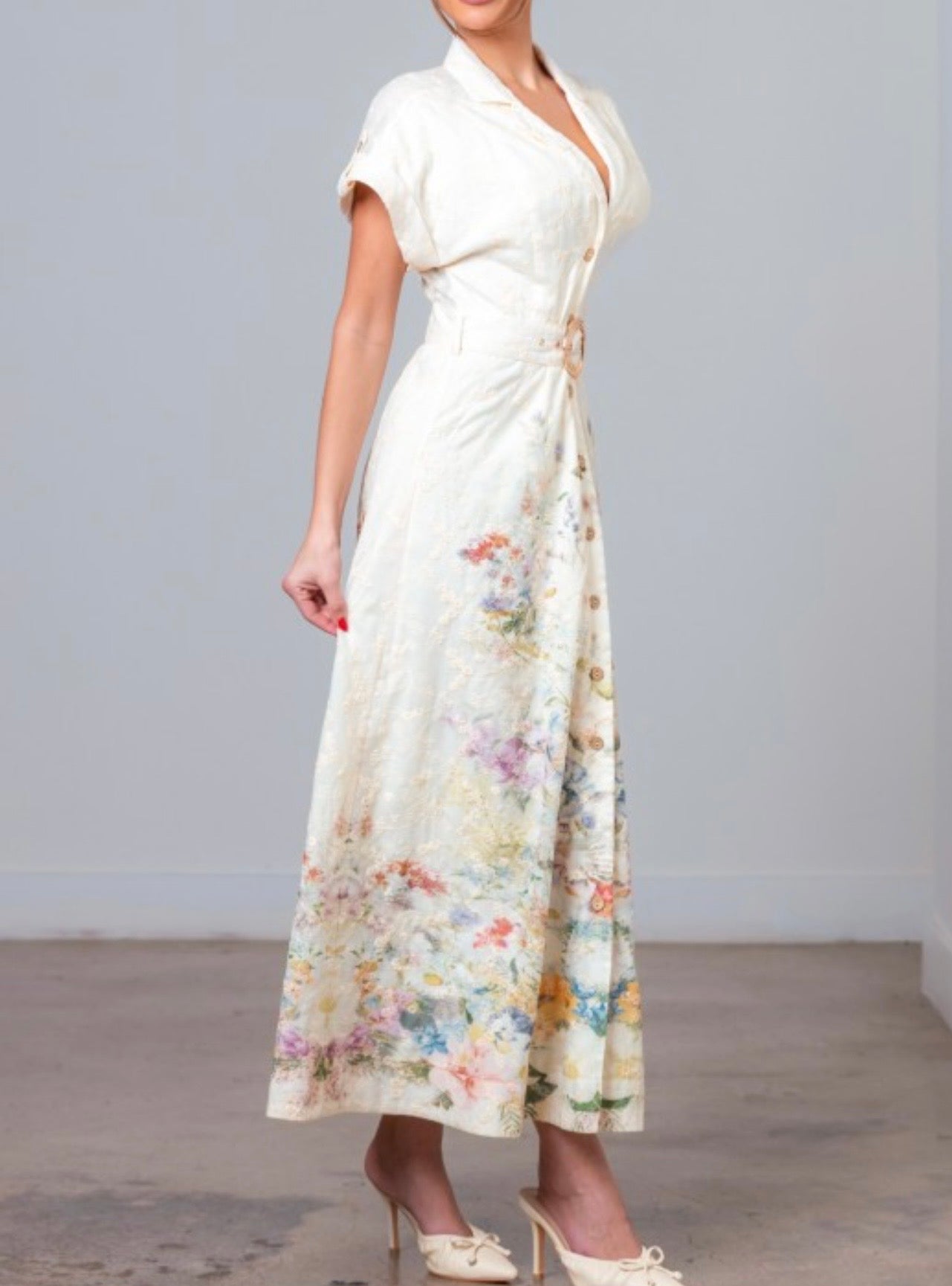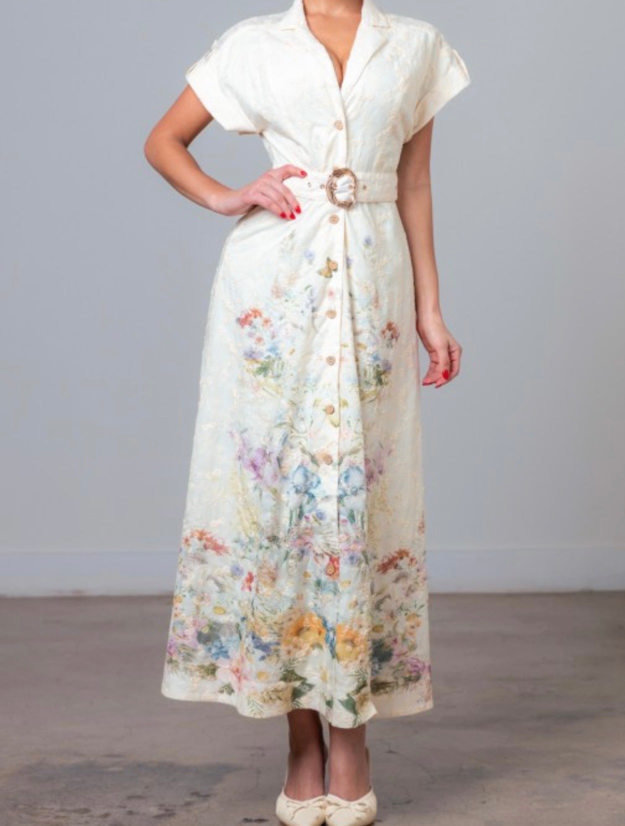 Floral Embroidered Belted Maxi Dress featuring delicate floral embroidery in a cream multi color palette. Designed with a flattering fit-and-flare silhouette, this button-down maxi dress includes a V-neckline, classic collar, short sleeves with button tabs, and a full lining for added comfort. Finished with an adjustable belt to define the waist for a feminine and polished look.