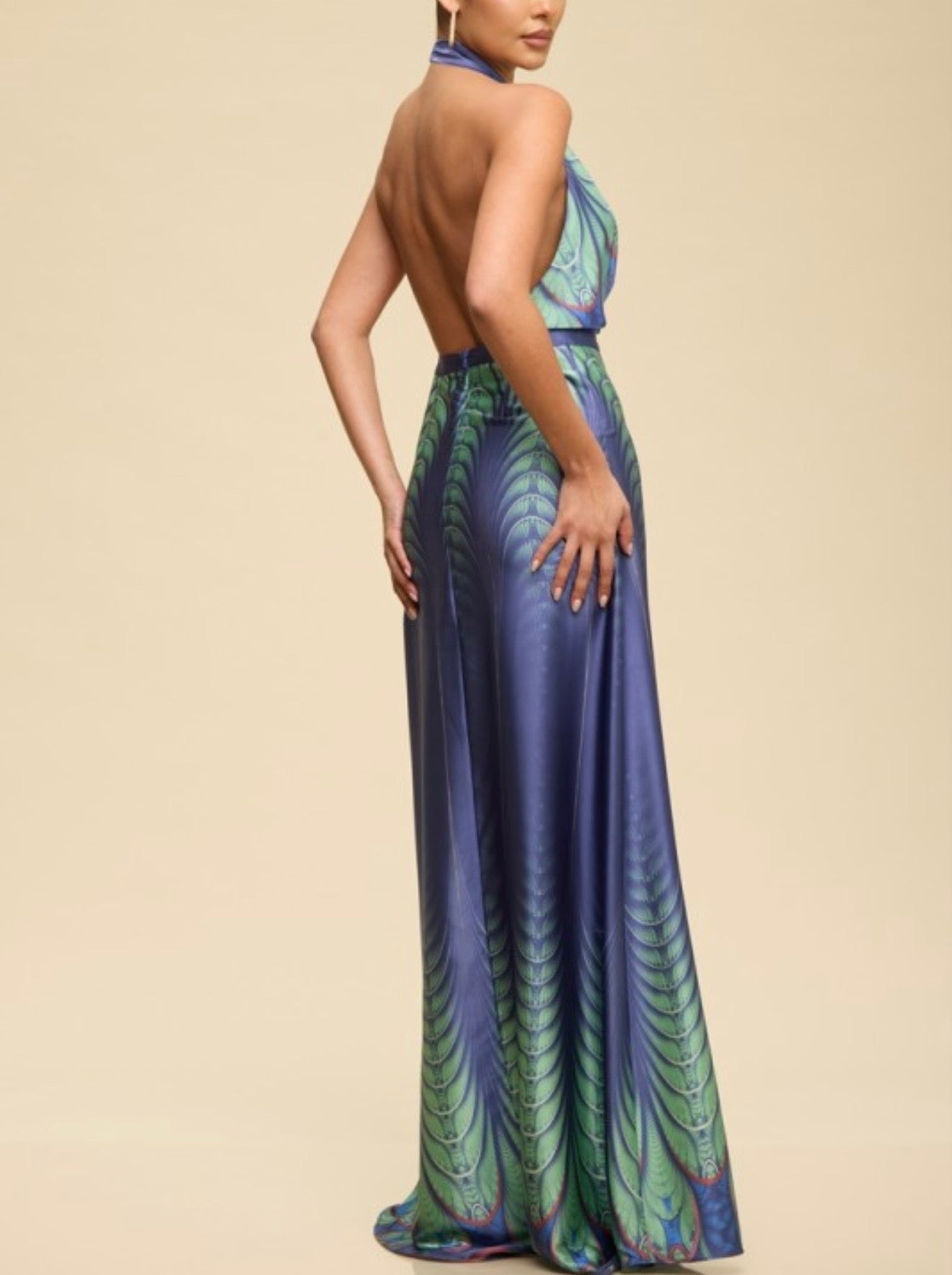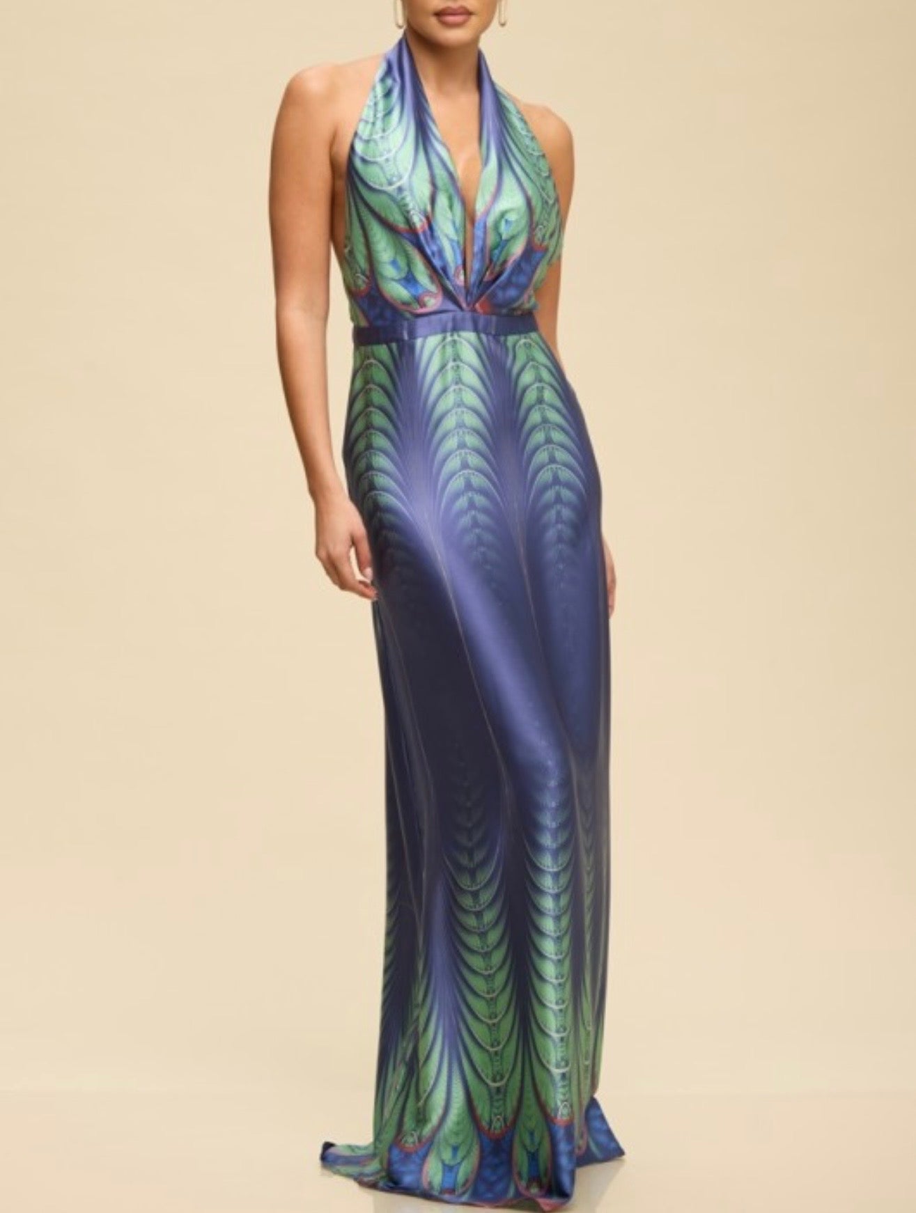 A striking halter gown featuring an intricate peacock-inspired print in rich shades of emerald, teal, and deep sapphire. Designed with a plunging neckline and a fitted silhouette, this dress beautifully contours the body while elongating the frame. The silky, smooth fabric drapes effortlessly to the floor, creating a sleek and polished finish. Perfect for formal evenings, upscale events, or special occasions where you want to make a bold, unforgettable statement.