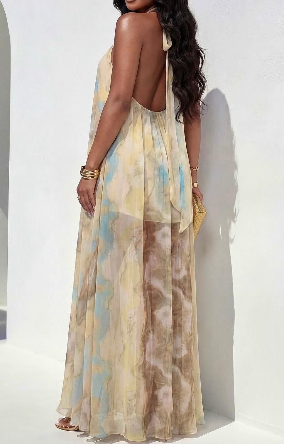 An effortlessly elegant halter maxi dress featuring a soft watercolor-inspired print in warm golden hues with subtle hints of blue and taupe. Designed with a flowy, lightweight fabric that drapes beautifully, this piece highlights a gathered neckline and an open, breezy silhouette. The thigh-high front slit adds a touch of allure and movement, making it perfect for warm evenings, vacations, or upscale summer events. Pair it with metallic heels and statement accessories for a polished, radiant look.