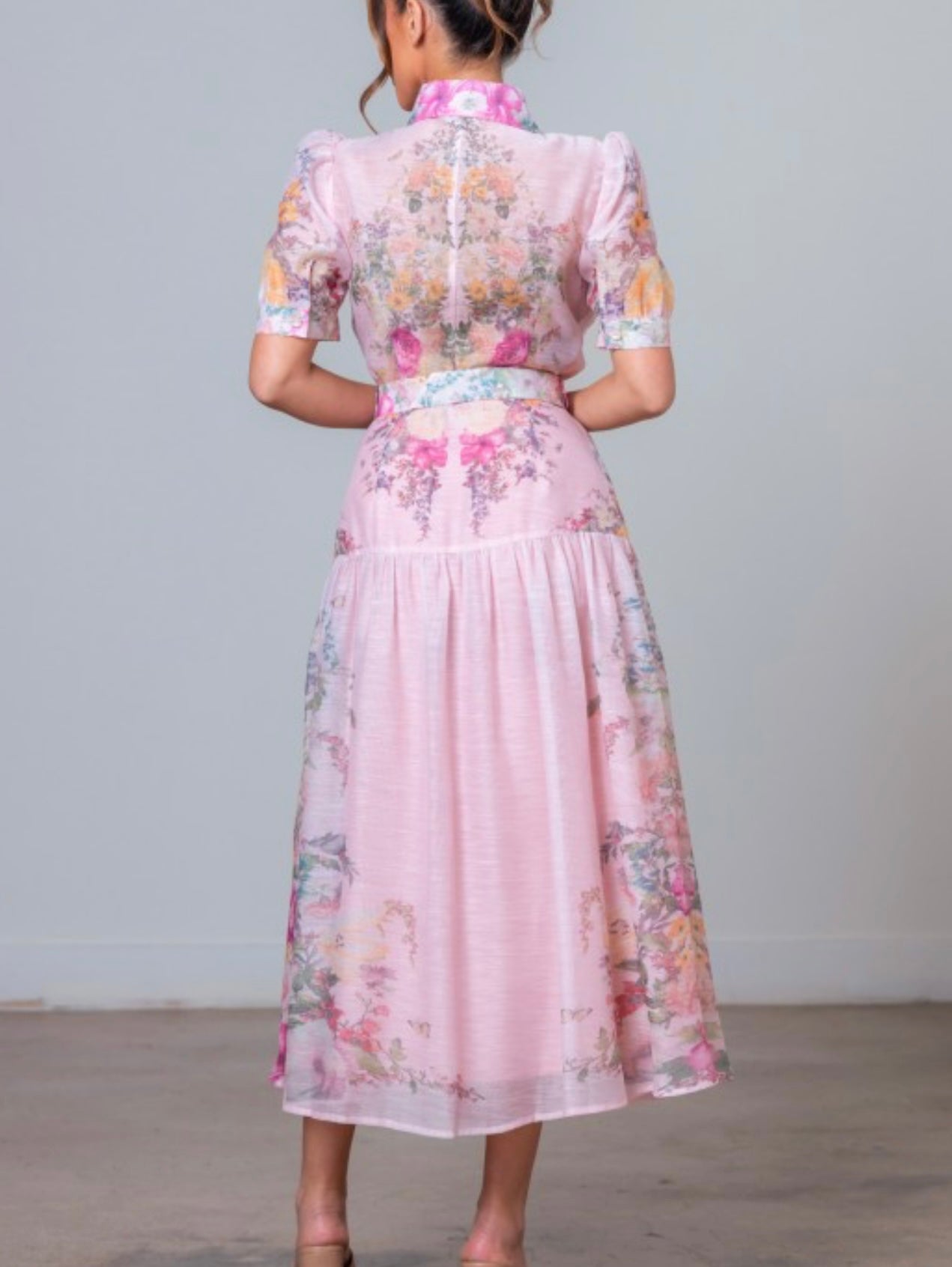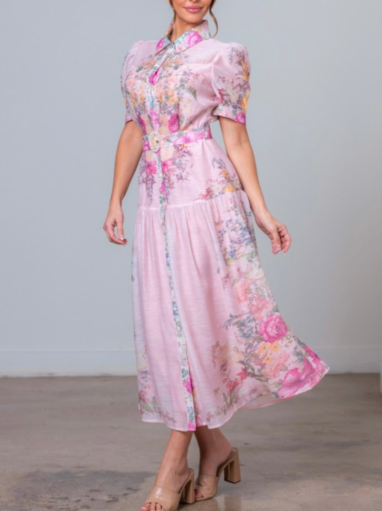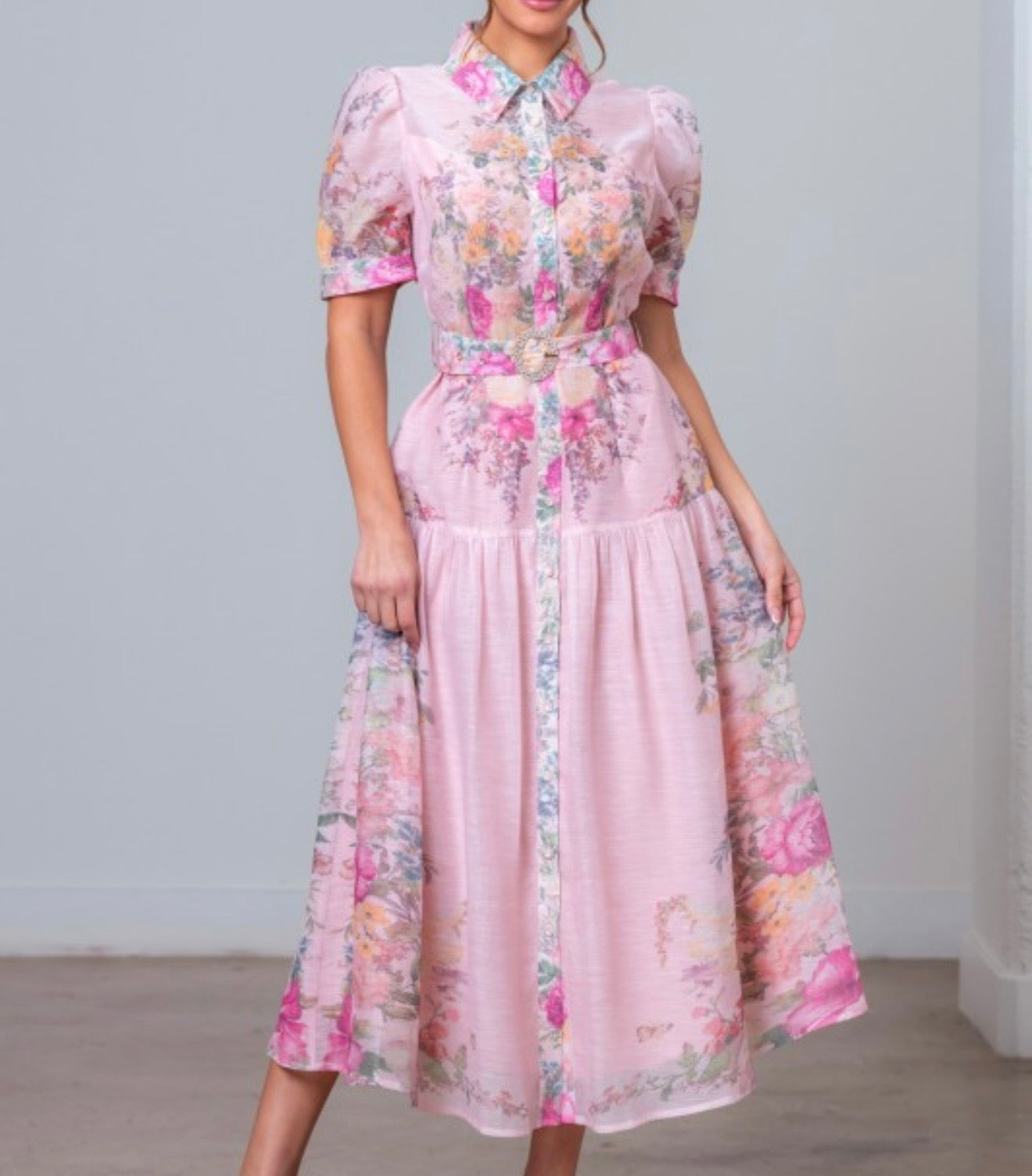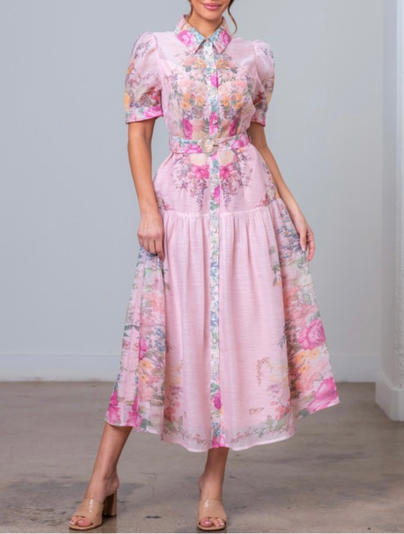 This elegant floral midi dress blends classic charm with feminine details. Featuring a collared neckline and button-down front, it offers a timeless, polished look. The short puff sleeves add a soft romantic touch, while the cinched waist with an adjustable belt creates a flattering fit-and-flare silhouette. Fully lined and designed with no stretch, this midi dress maintains its structured shape while flowing beautifully with every step. Perfect for brunch, special occasions, or effortless daytime elegance.