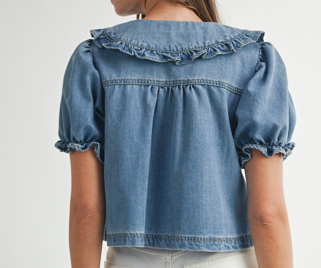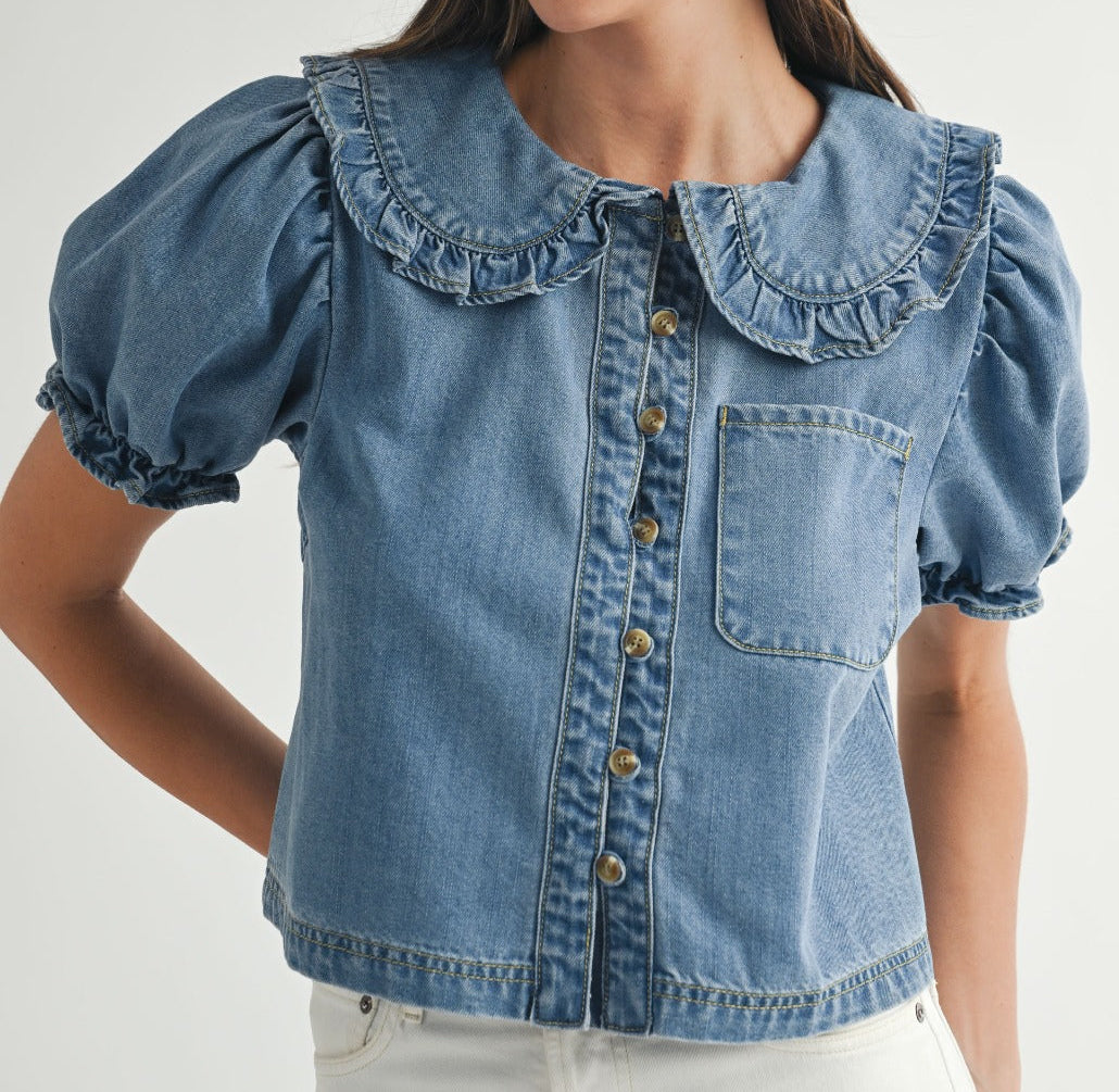 Effortlessly chic with a touch of vintage charm, this denim blouse features puff sleeves and a ruffled Peter Pan collar that add feminine flair to a classic fabric. Designed with front button closures and a single chest pocket for a timeless finish. Its slightly cropped silhouette pairs perfectly with high-waisted pants or skirts, making it a versatile piece that transitions seamlessly from casual brunch to weekend strolls.