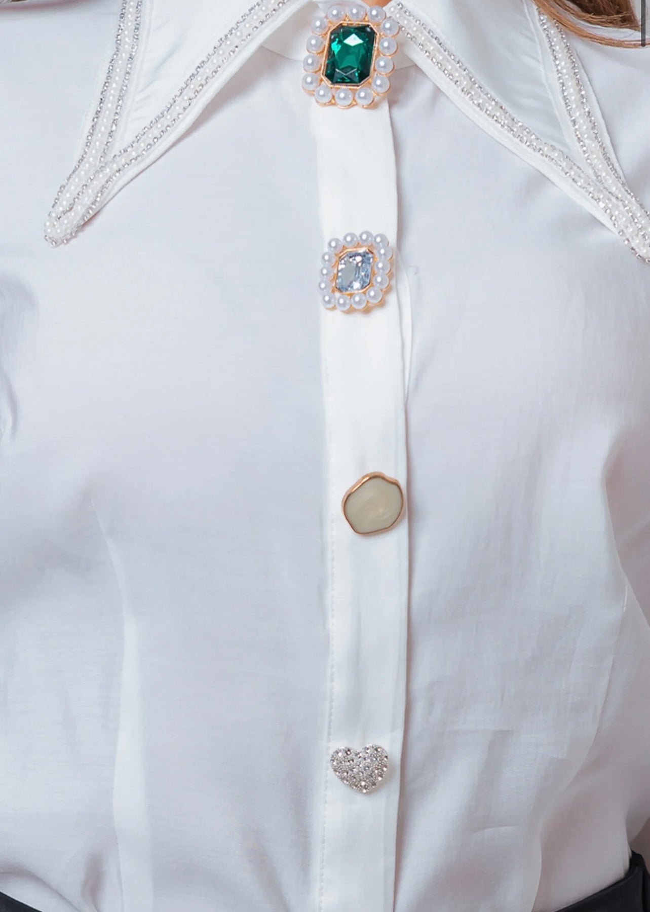 Add a touch of sparkle to your look with this chic button-down blouse featuring a pointed rhinestone-embellished collar and playful mix-button accents. Designed with a cinched waist for a flattering fit and finished with long cuff sleeves for a touch of sophistication.