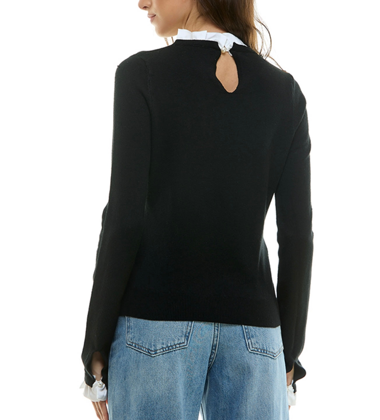 This elegant black sweater features beautiful floral embellishments along the neckline. Perfect for adding a touch of sophistication to any outfit.