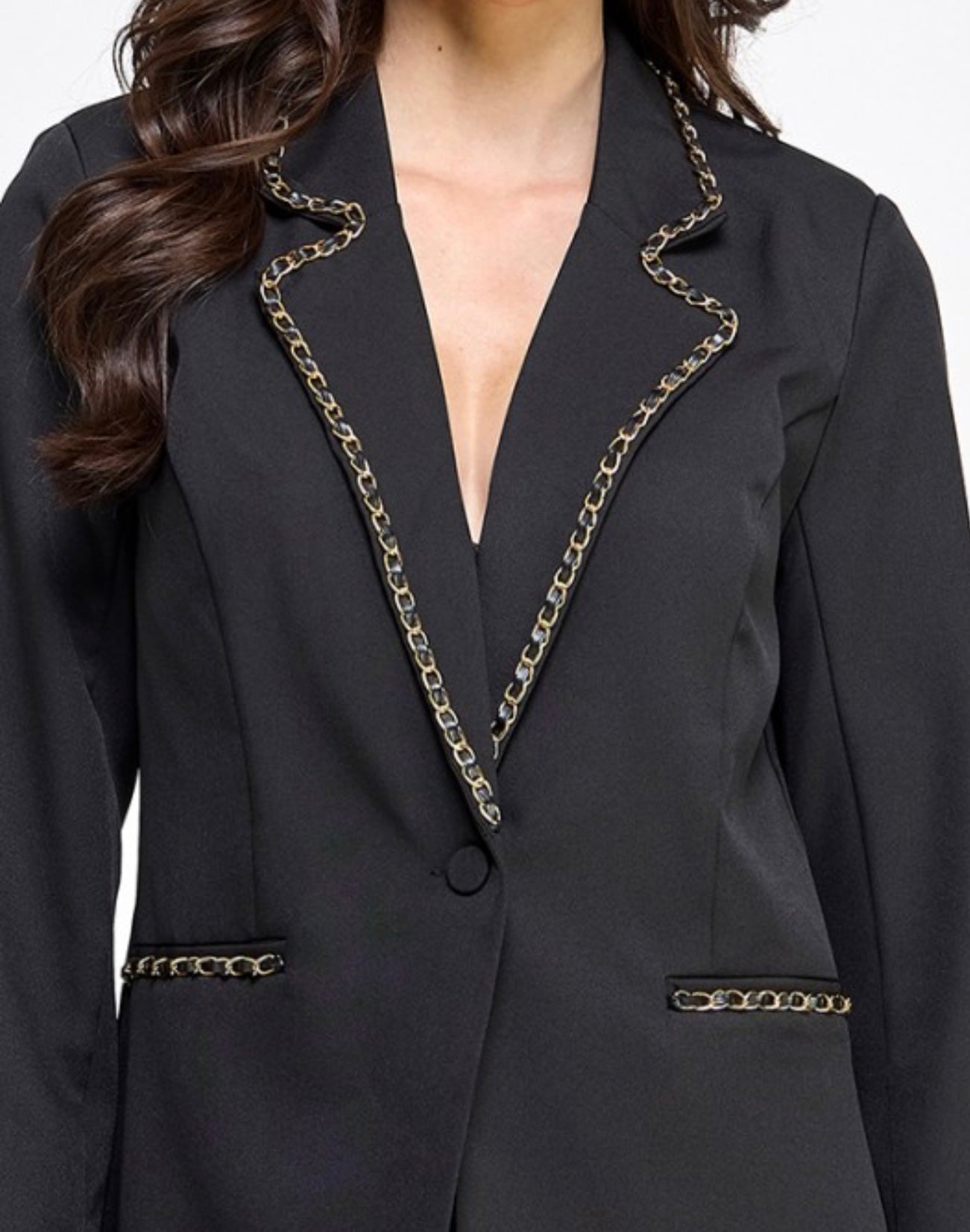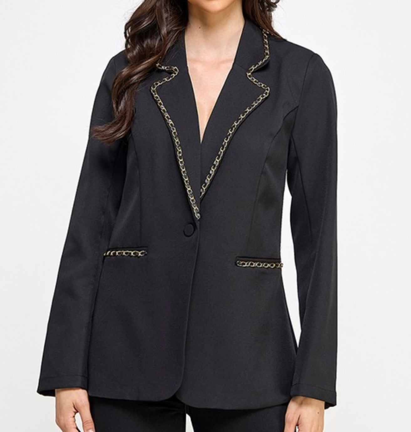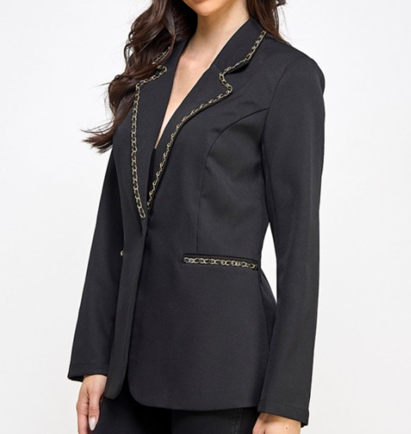 This sophisticated black blazer features stylish chain detailing, perfect for elevating any outfit. Ideal for both professional and casual settings.