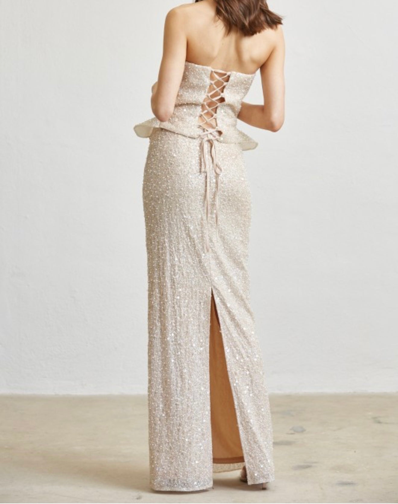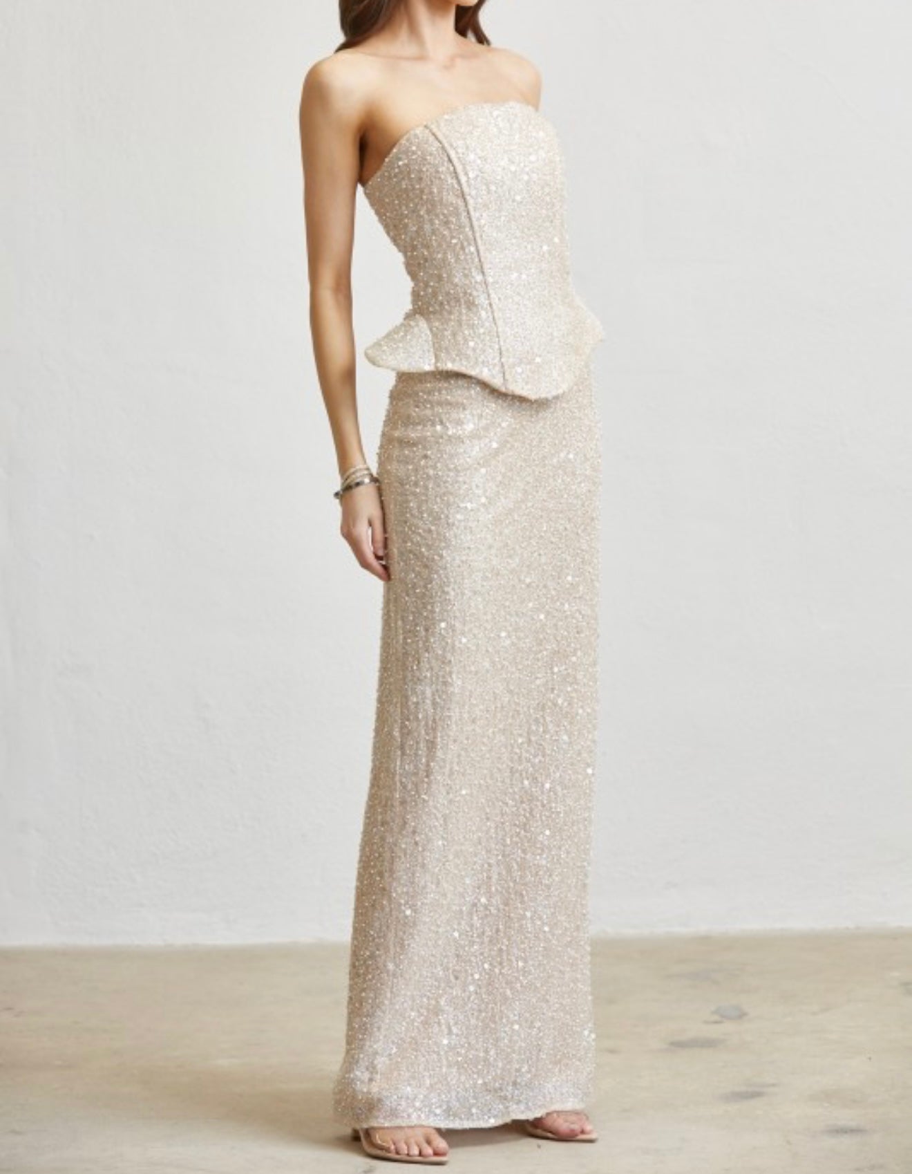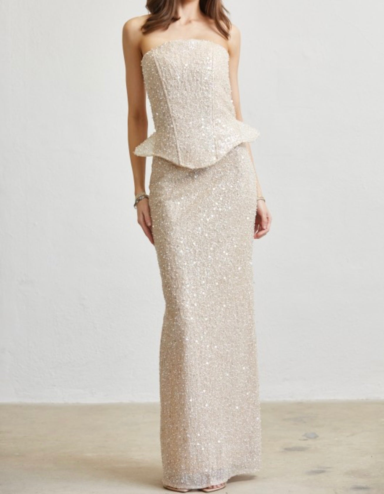 A stunning strapless gown crafted from a soft stretch-sequin fabric that sparkles with every move. Designed with a structured bodice and subtle peplum waist to shape and define your silhouette, this piece falls into a sleek, floor-length skirt for an elegant, elongated fit. Perfect for any formal event where you want to glow effortlessly.