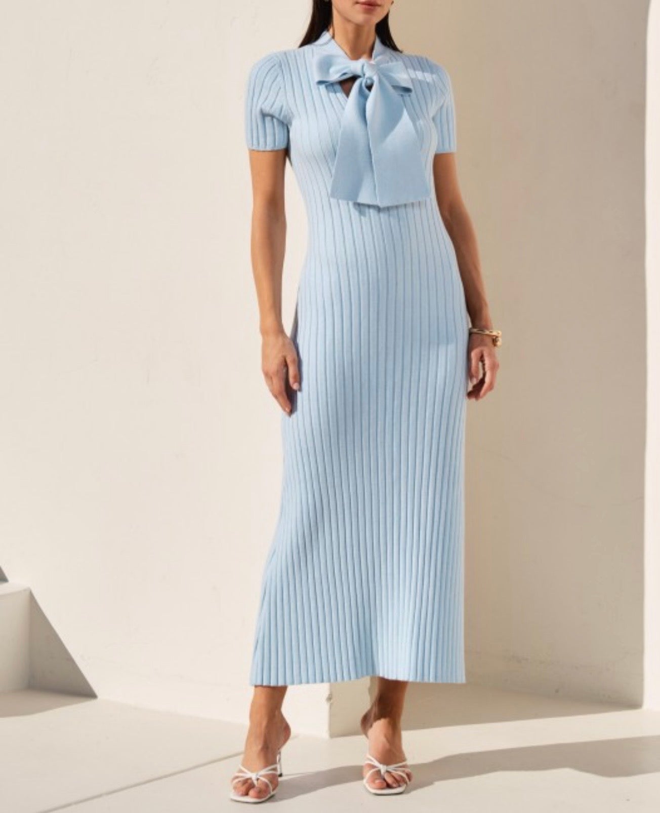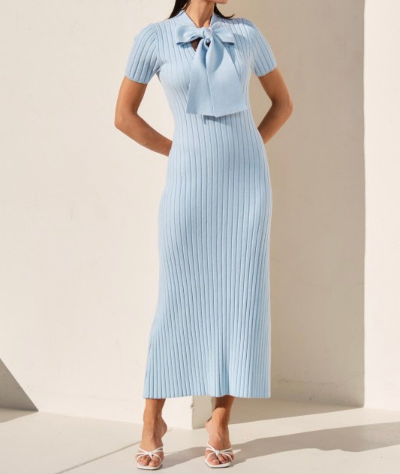 This elegant light blue midi dress features a refined ribbed knit texture that contours the body for a sleek, flattering silhouette. Designed with a high neckline and statement bow tie detail, it blends classic sophistication with modern femininity. Short sleeves and a streamlined shape make it versatile for both daytime events and polished evening looks, while the soft stretch knit ensures comfort without sacrificing structure.