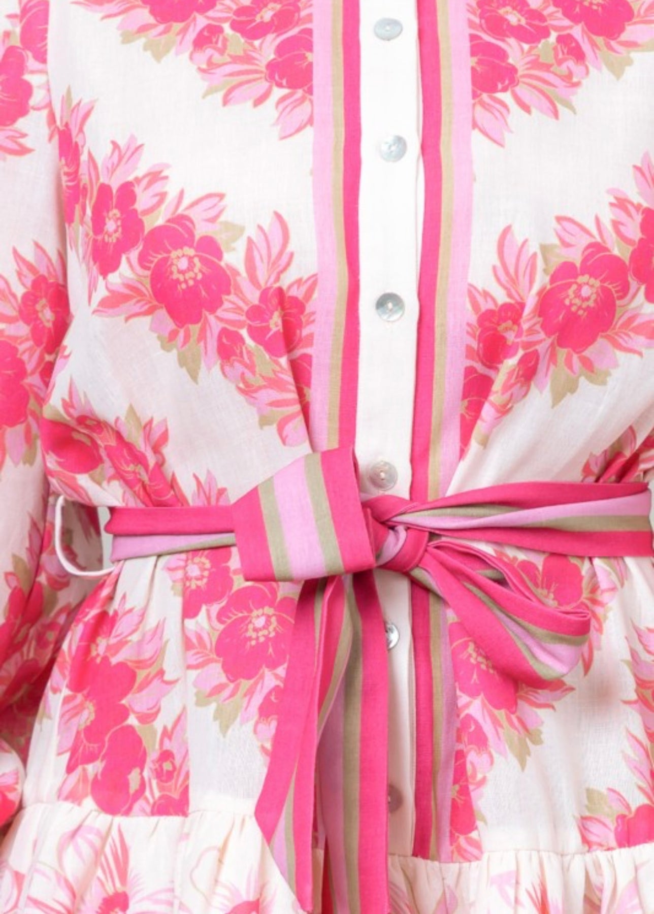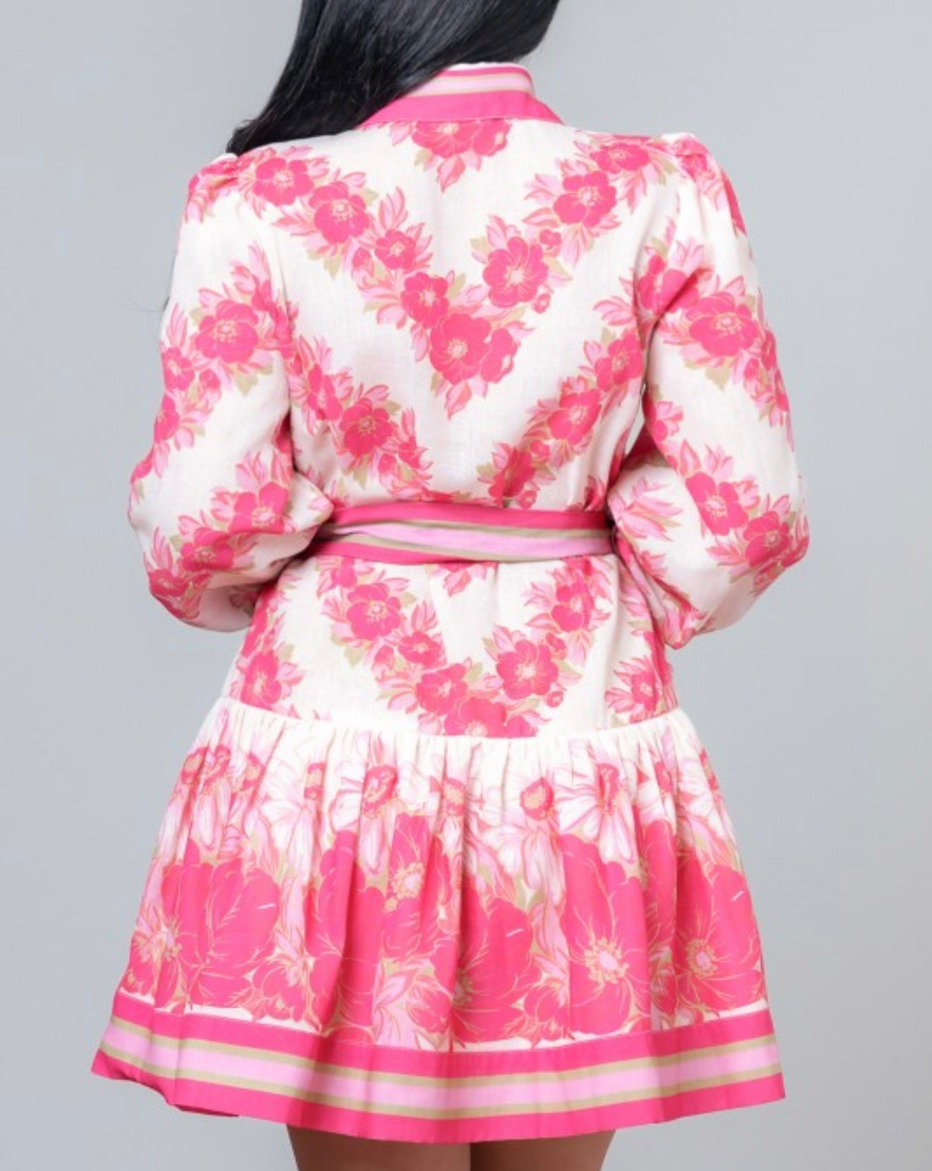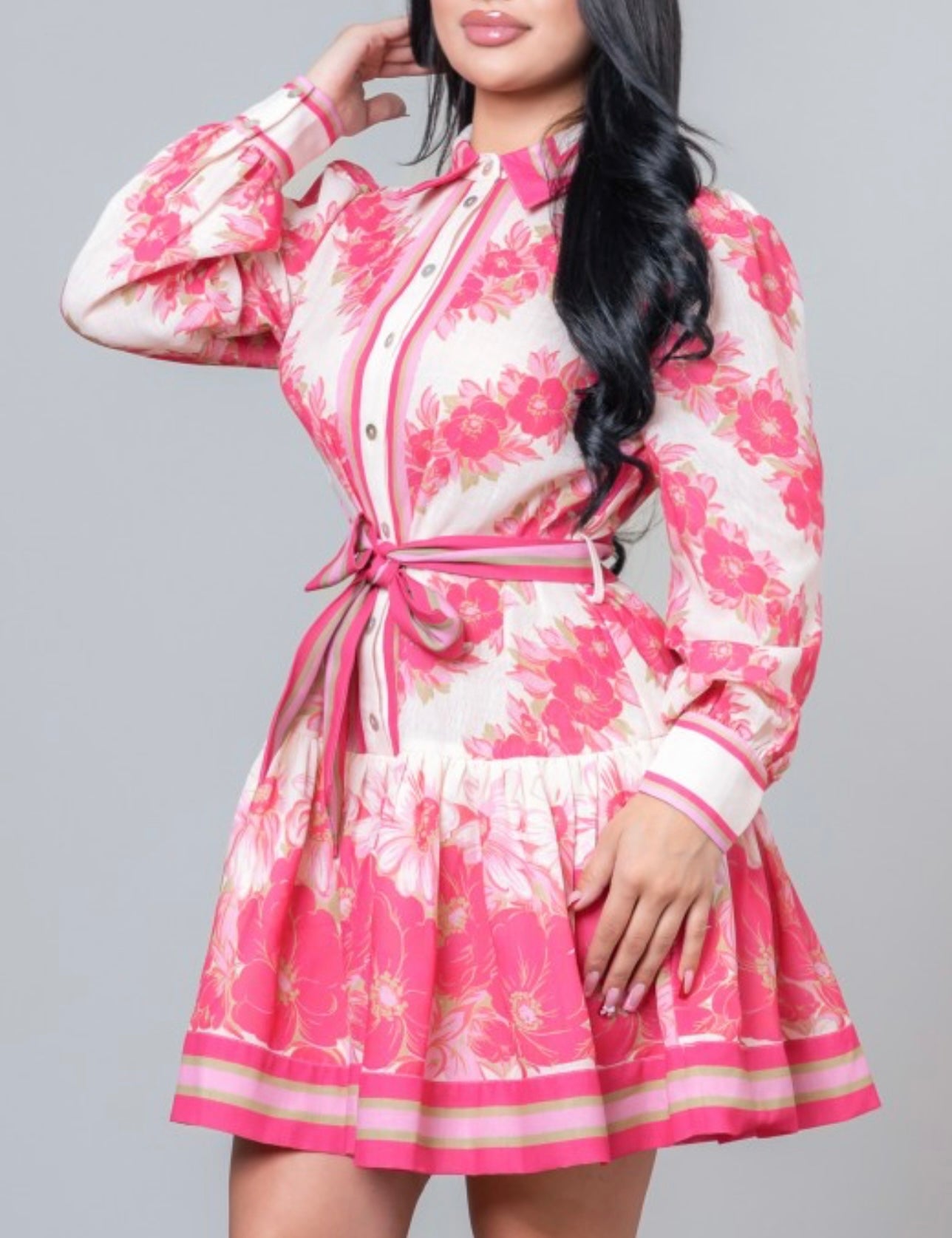 Romantic and feminine, this floral mini dress features a classic collared neckline with a button-down front for a polished touch. Designed with long cuffed sleeves and a cinched waist with a self-tie belt, it creates a flattering fit-and-flare silhouette. The lined mini skirt adds comfort and flow, while the no-stretch fabric keeps its structured shape. Finished in a soft cream base with vibrant pink floral detailing, this dress is perfect for brunch, daytime events, or spring celebrations.