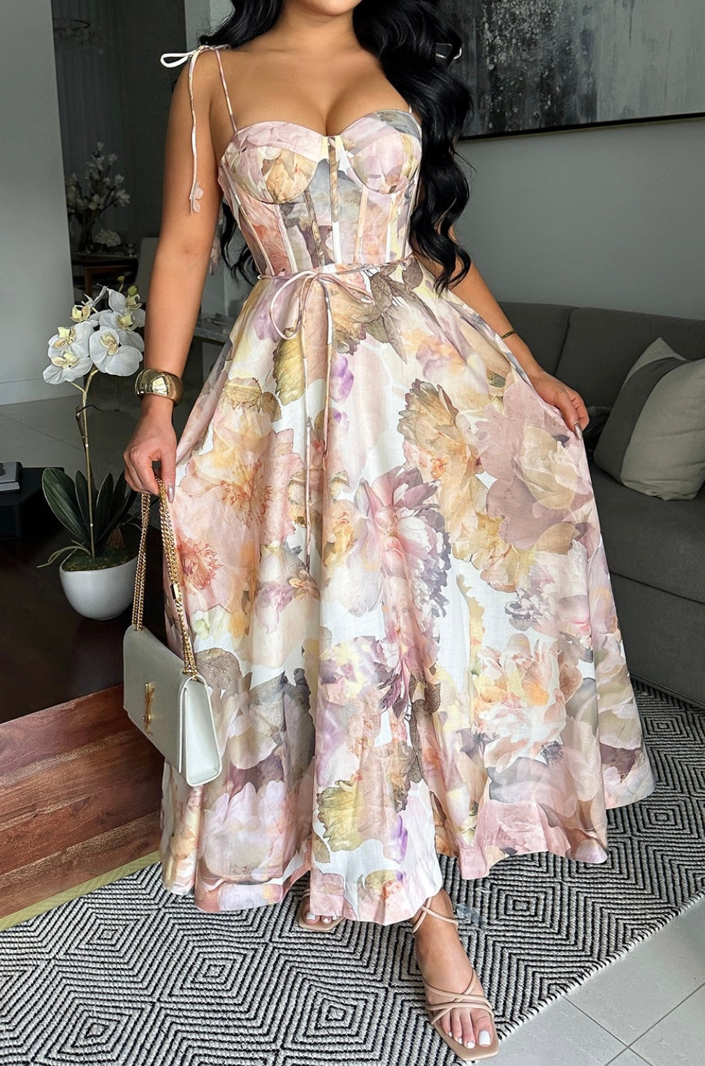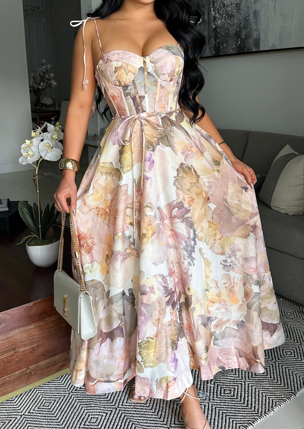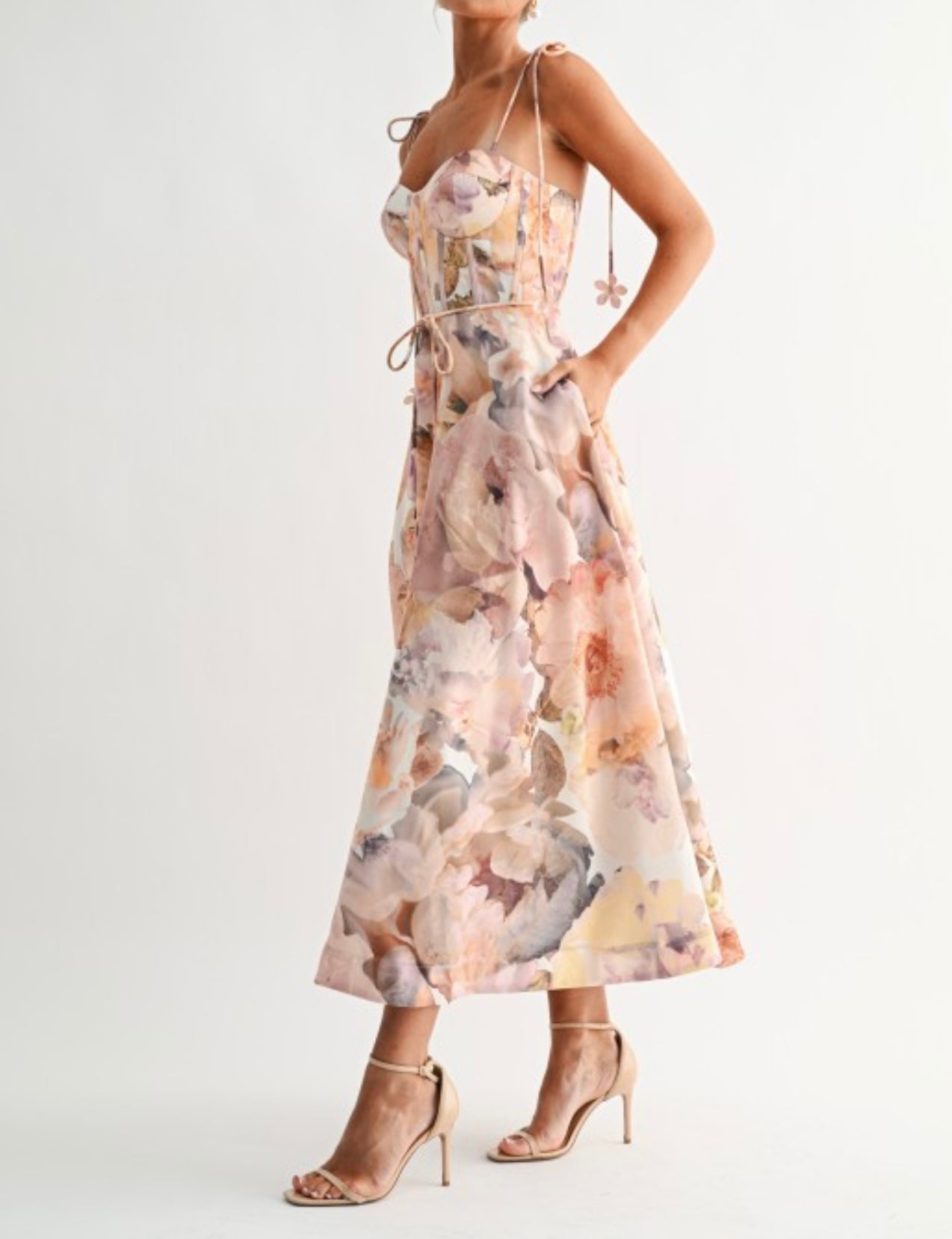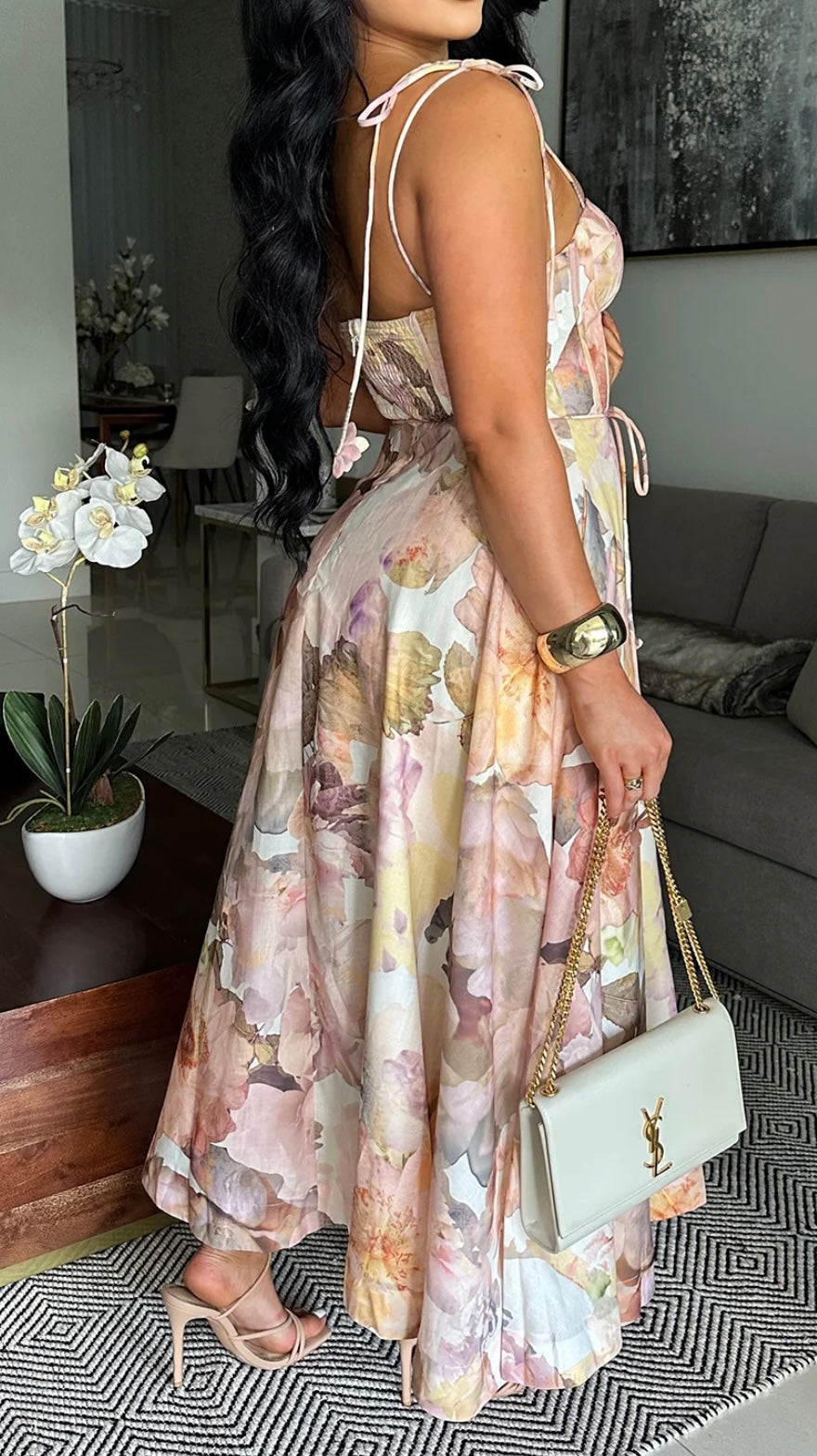 A romantic floral print midi dress designed to captivate from every angle. Featuring a sculpted corset bodice with molded bust cups for structure, tie shoulder straps with delicate floral accents, and a soft flowing skirt that drapes effortlessly. Smocking at the mid-back ensures a comfortable fit, while the back zipper allows for easy wear.
