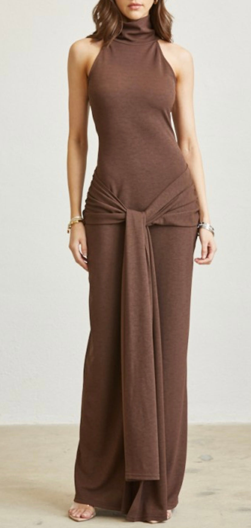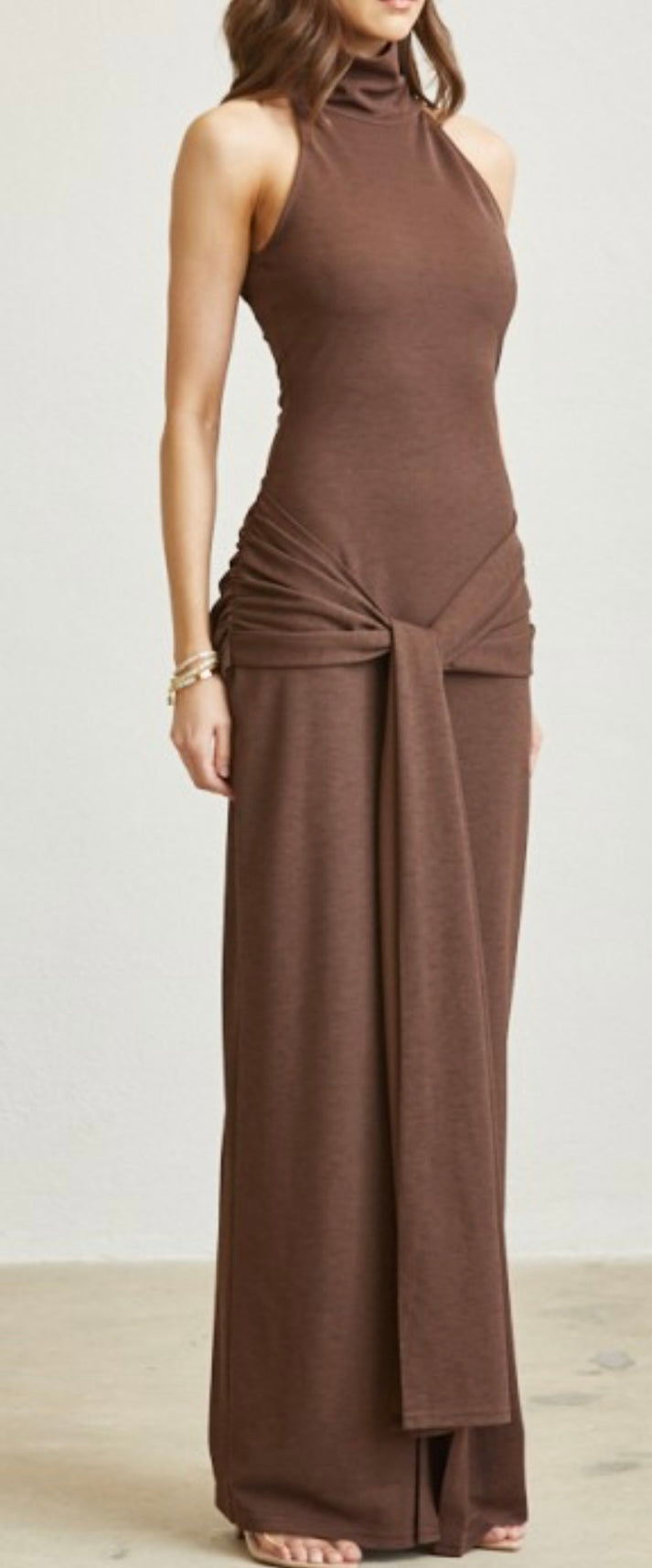Tie front mock neck maxi dress. Stretchy textured woven fabric turtle neck dress. Ruched tie front strap detail. Back zipper closure.