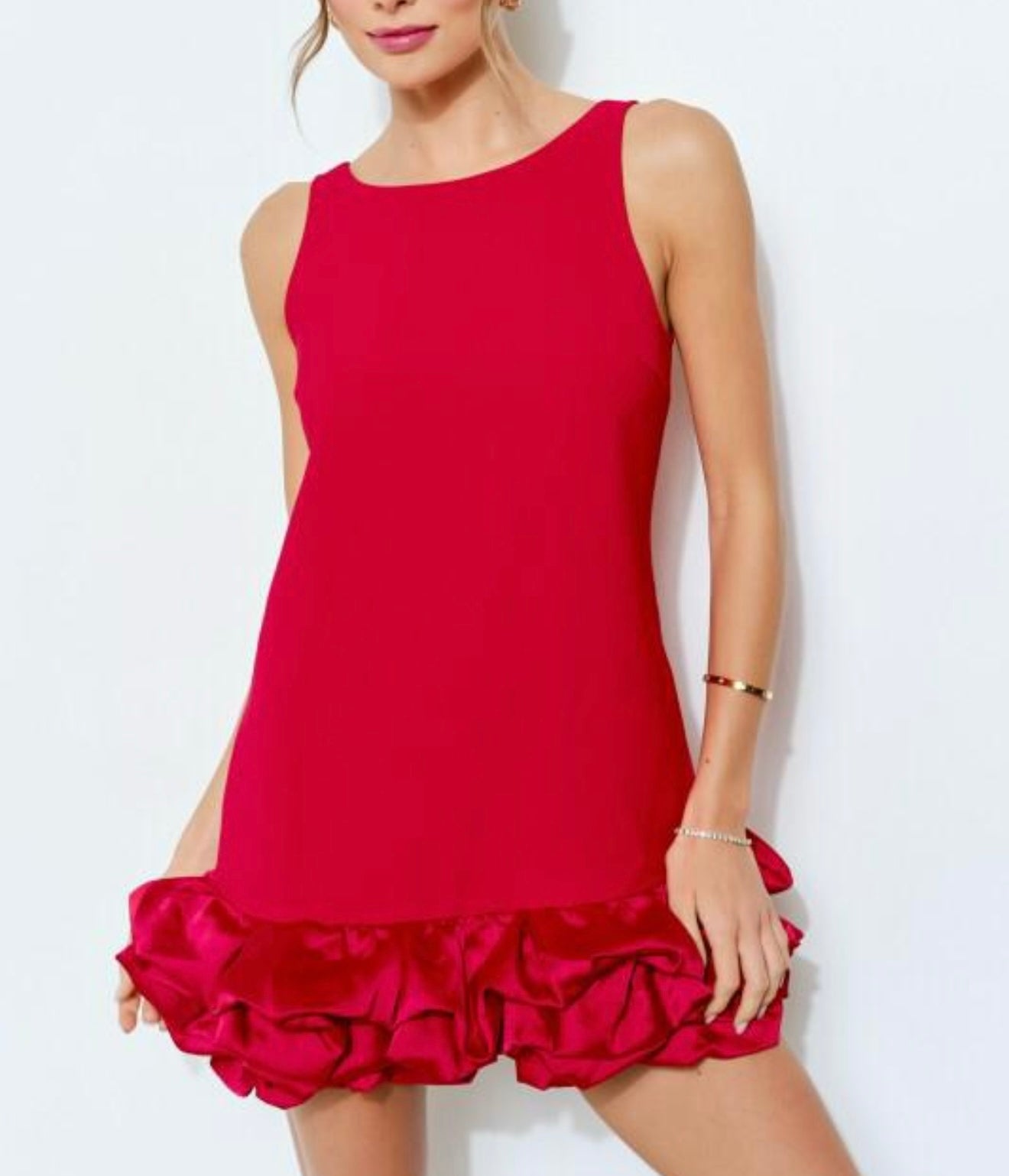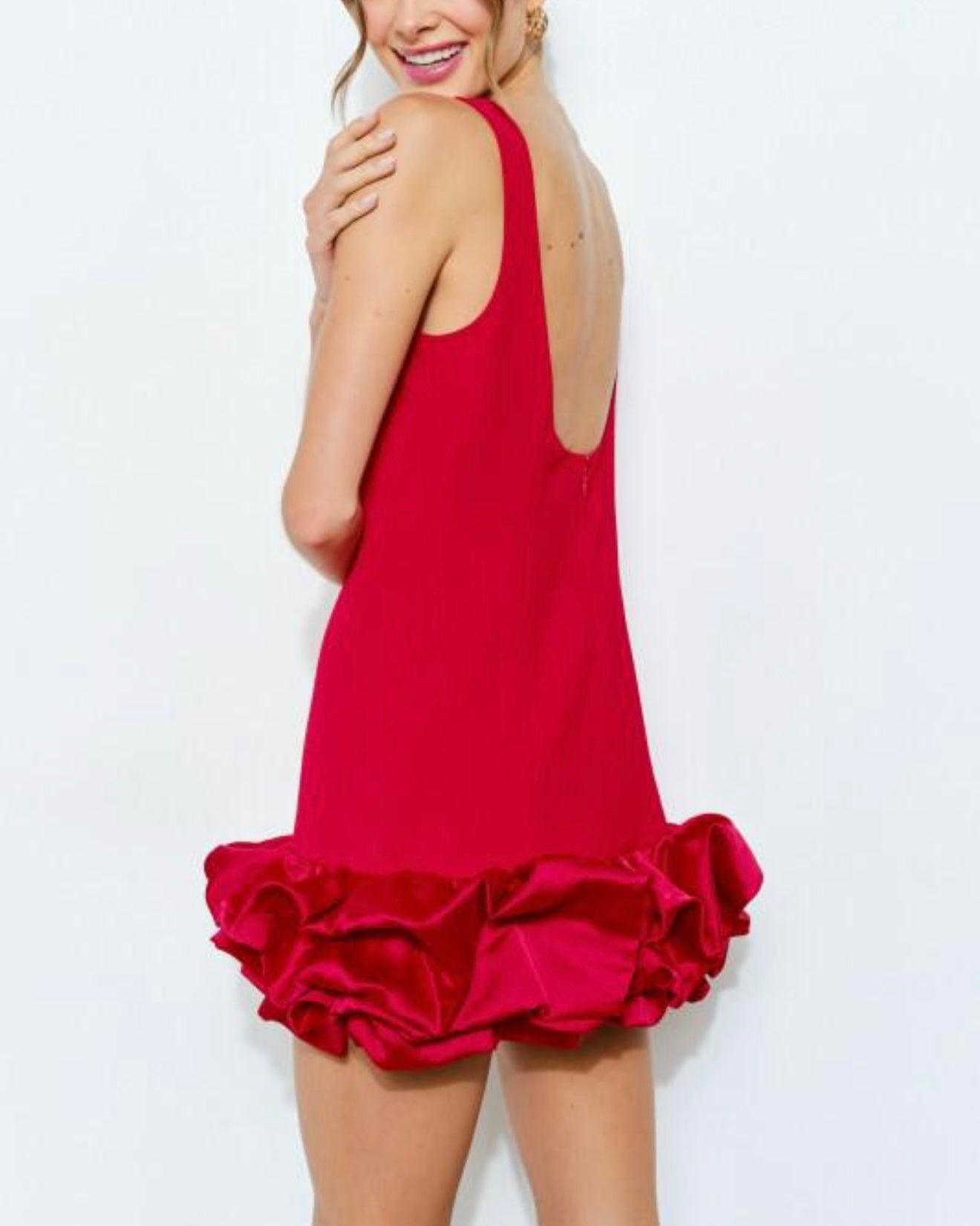 Chic red sleeveless dress featuring a playful ruffle hem. Perfect for any occasion.