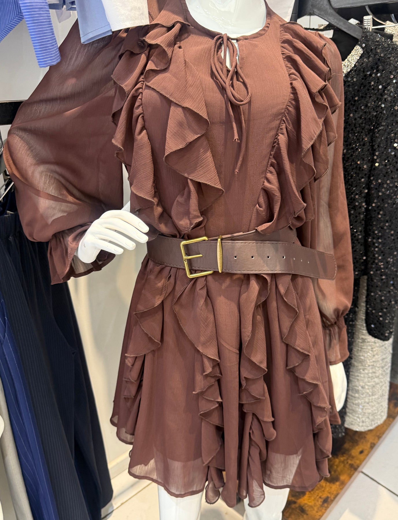 This lightweight chiffon dress features cascading ruffles along the front and skirt for a flowy, feminine silhouette. The long sheer sleeves add a touch of softness, while the tie-neck detail keeps the look sweet and polished. A wide statement belt cinches the waist, creating shape and giving the dress a chic, structured contrast. Perfect for brunch, events, or anytime you want a flirty yet sophisticated look.