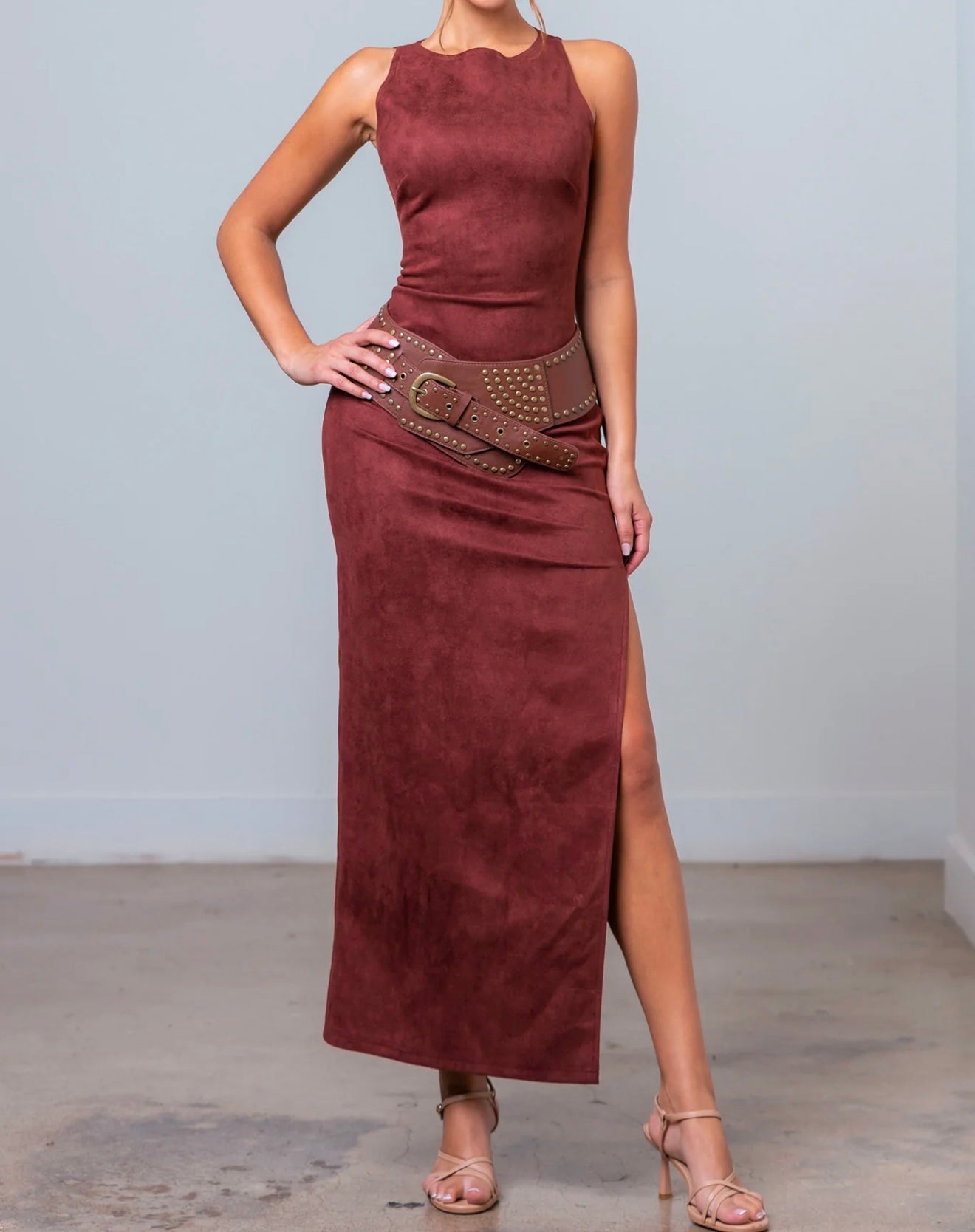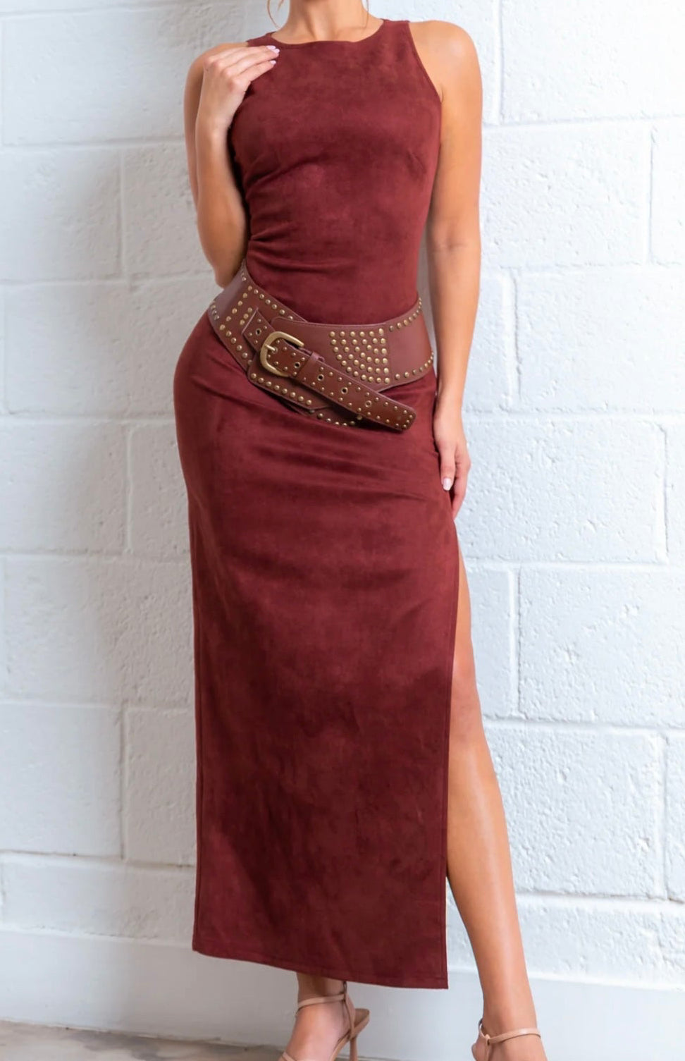 Elevate your look with this stunning Suede Solid Belted Maxi Dress, crafted from luxe suede fabric in rich Burgundy or Olive tones. Designed with a flattering cinched waist and adjustable belt to accentuate your shape, this sleeveless silhouette features a sleek round neckline and elegant mermaid fit that flows into a graceful maxi length. Complete with a side slit for added movement and a concealed back zipper for a smooth finish.