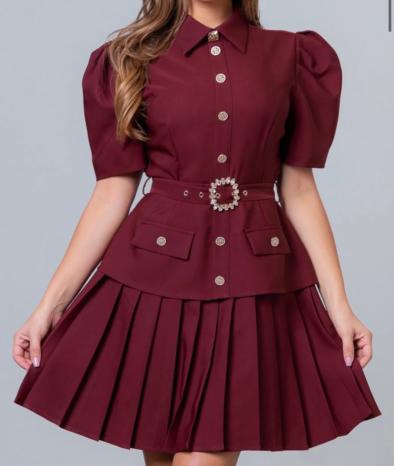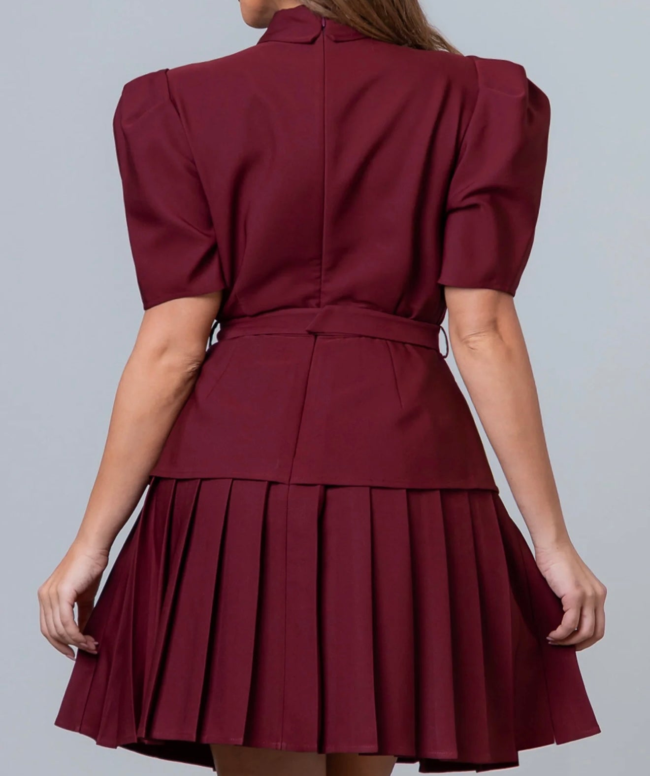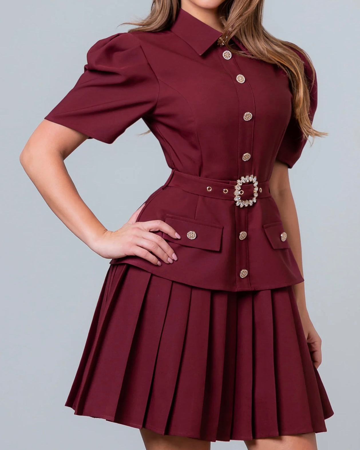 Pleated mini dress featuring short sleeves, button-front detailing, and a matching belt for a polished finish.