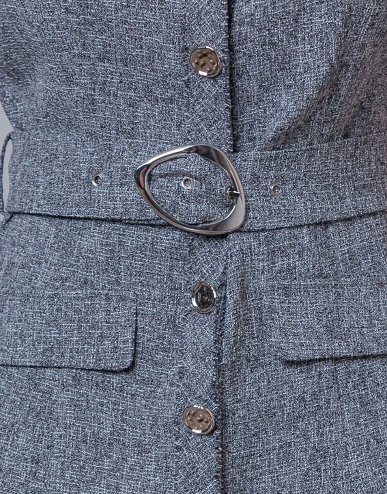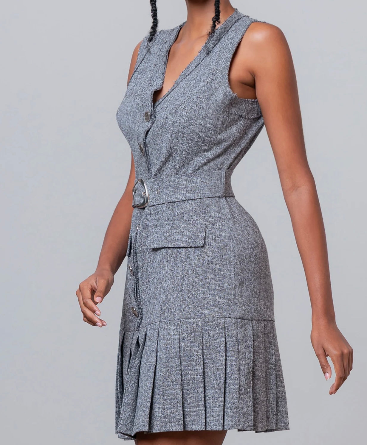 - Details: Pleated, Adjustable Belt, Button Down, Mini, Cinched Waist, Sleeveless, Tweed, V-neck.